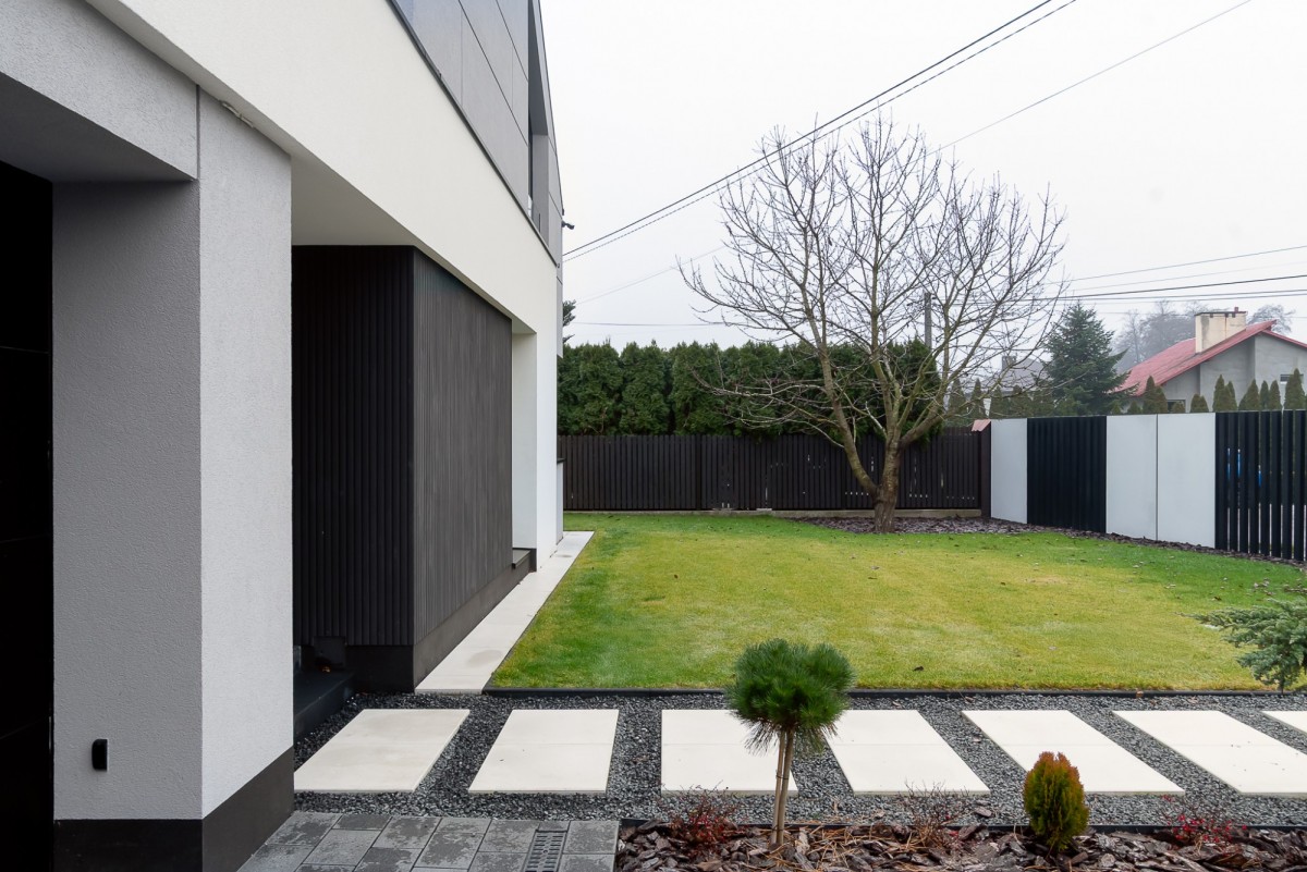 • nowoczesne ogrodzenie (aluminium i płyty z betonu architektonicznego)