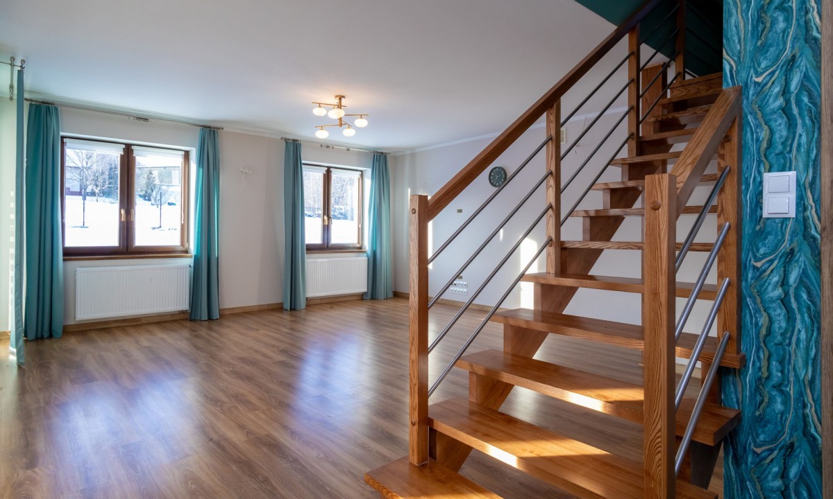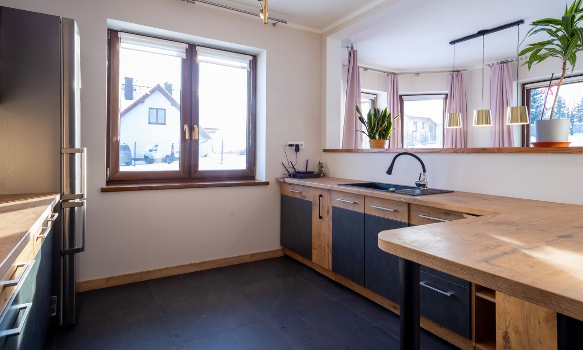 Na parterze łazienka z prysznicem, gabinet/ sypialnia, otwarta przestrzeń z kuchnią, jadalnia, garaż i kotłownia.
