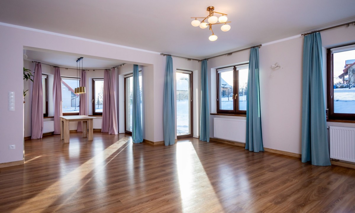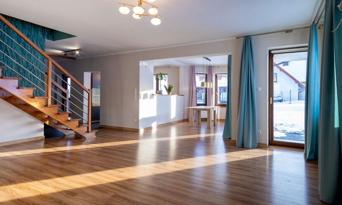 Na 21 arowej działce już stoi nowiutki, nowiusieńki dom z 4 sypialniami, salonem, jadalnią, kuchnią i dwoma łazienkami.