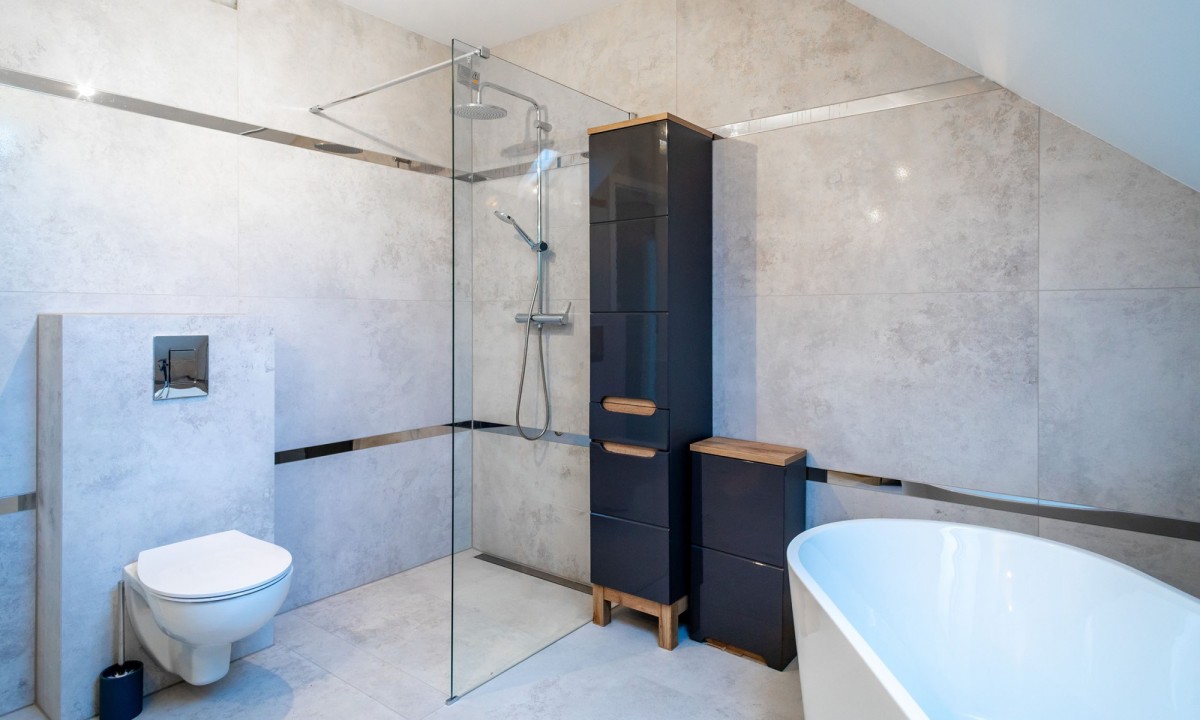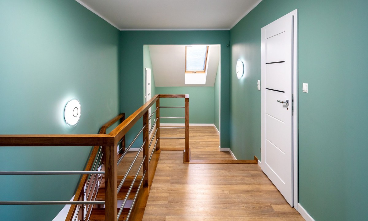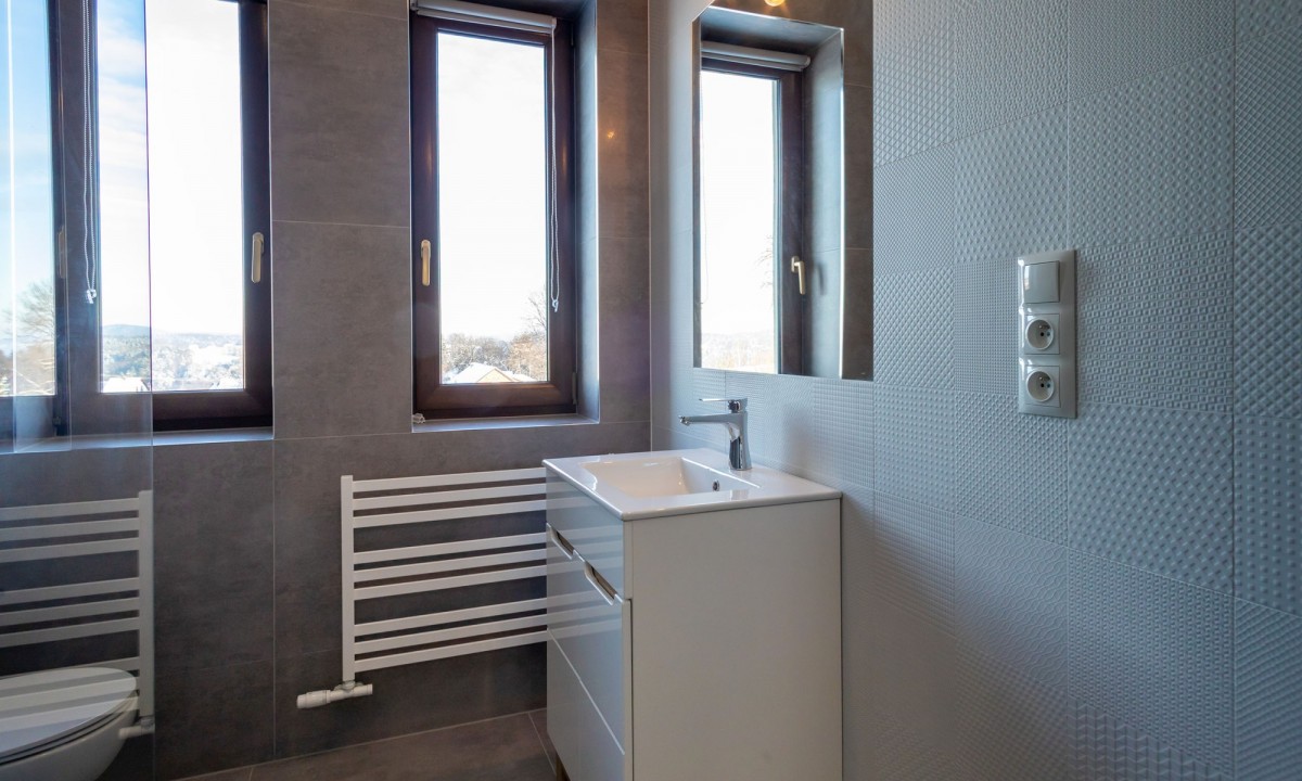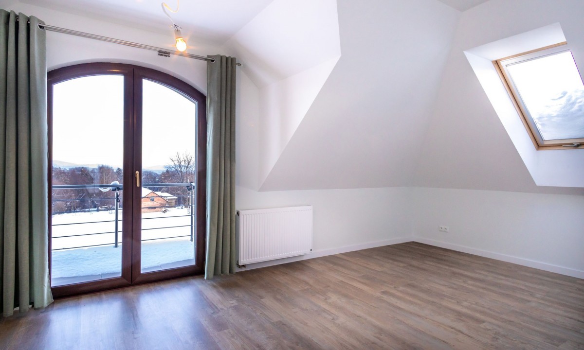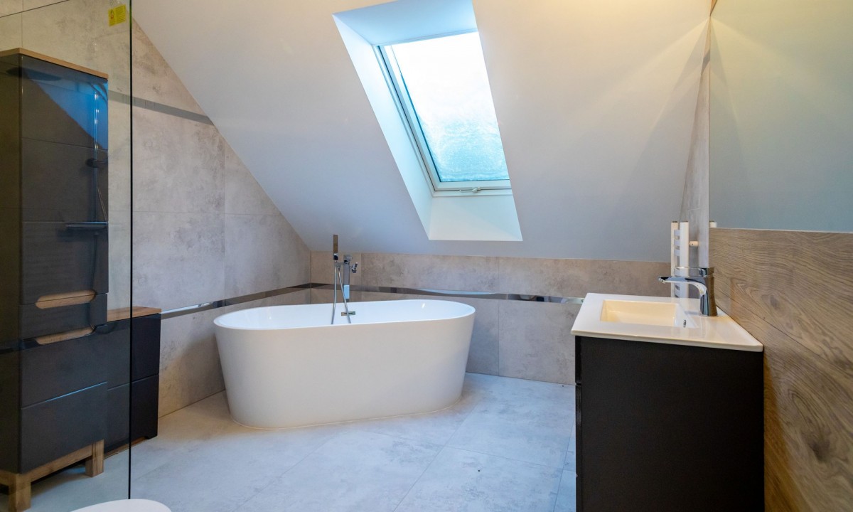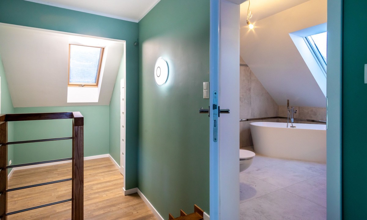 Na poddaszu 3 sypialnie, łazienka z wanną i prysznicem, 2 garderoby, pralnia.