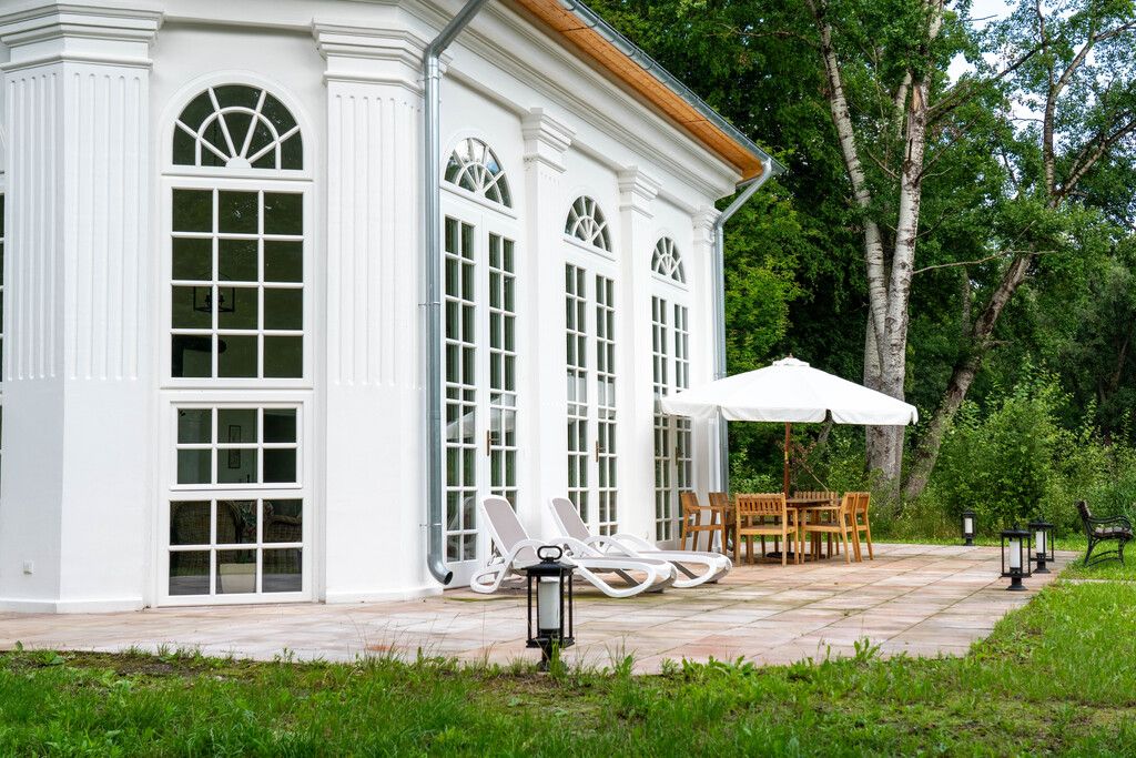 - Zabytkowa oranżeria/herbaciarnia nad stawem — stanowi dodatkowy, kameralny apartament z niepowtarzalnym klimatem.