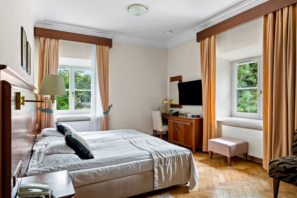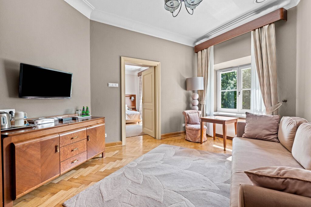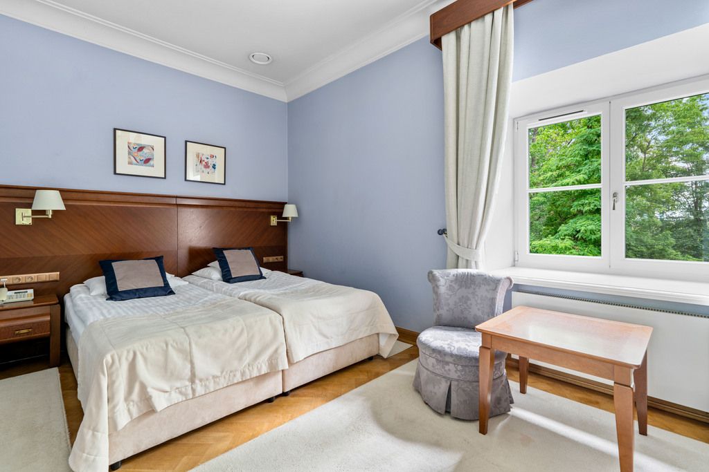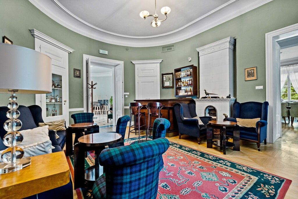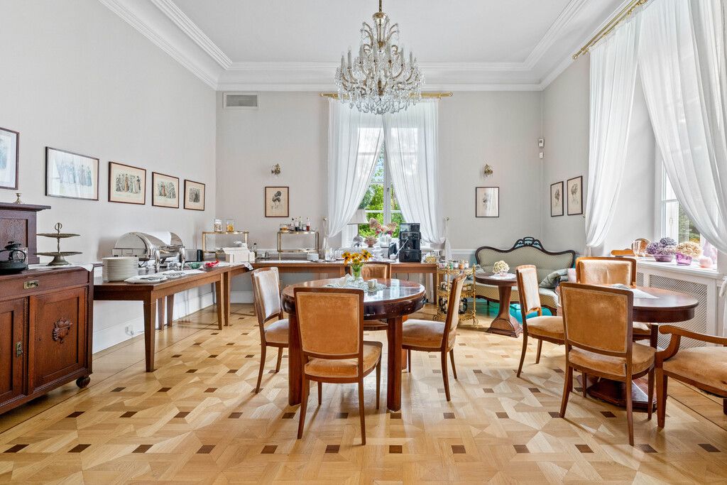 Opis ogólny Klasycystyczny pałac z początku XIX wieku, kompleksowo odrestaurowany z dbałością o każdy szczegół, oferuje 1 075 m² luksusowej powierzchni hotelowej, z 10 klimatyzowanymi pokojami (w tym 2 apartamentami) każdorazowo z łazienką oraz pełen wachlarz funkcji: restaurację, bar z biblioteką, salę kinowo‑konferencyjną, prestiżowe spa i oranżerię nad stawem. Przestrzeń pałacowa harmonijnie łączy historię oraz komfort — stworzona z myślą o gościach szukających doświadczenia najwyższej klasy.