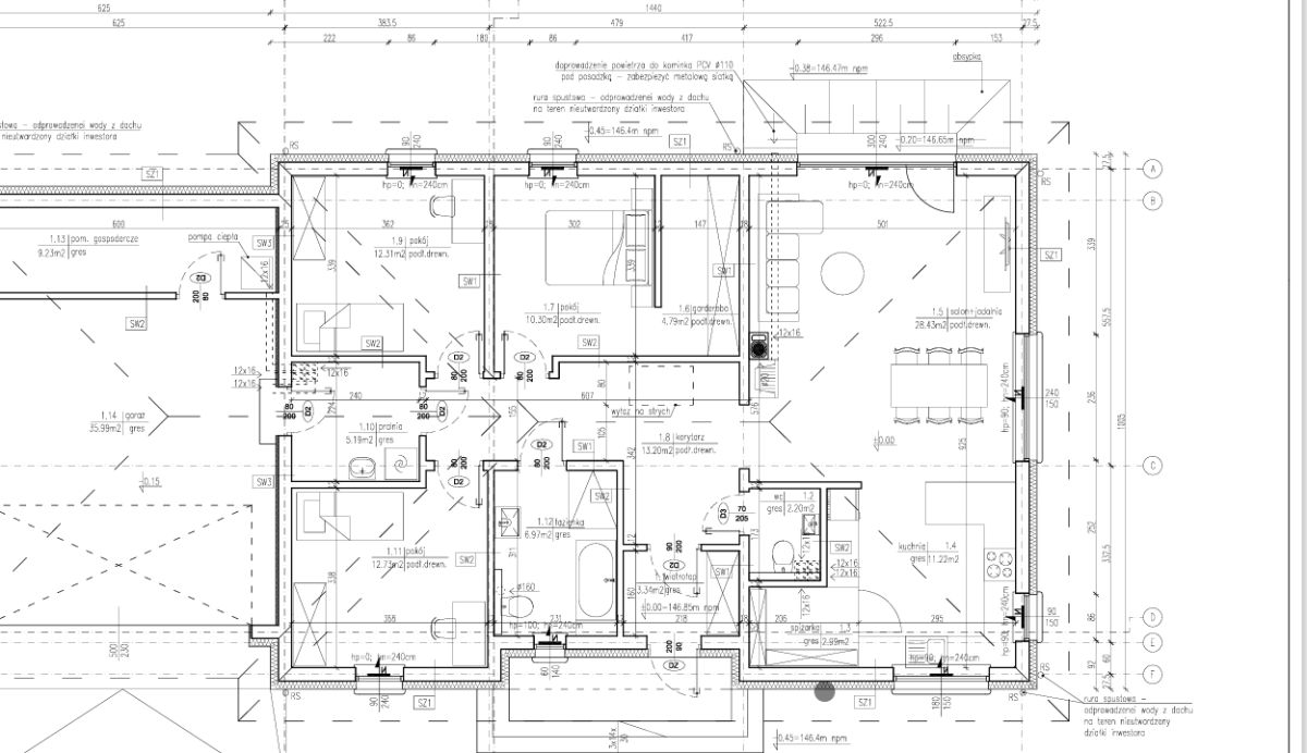 Dom parterowy o powierzchni 163 m 2, na którą składa się salon z dużymi przesuwnymi oknami połączony z kuchnią , trzy sypialnie, 2 łazienki, WC gościnne oraz garaż dwustanowiskowy.