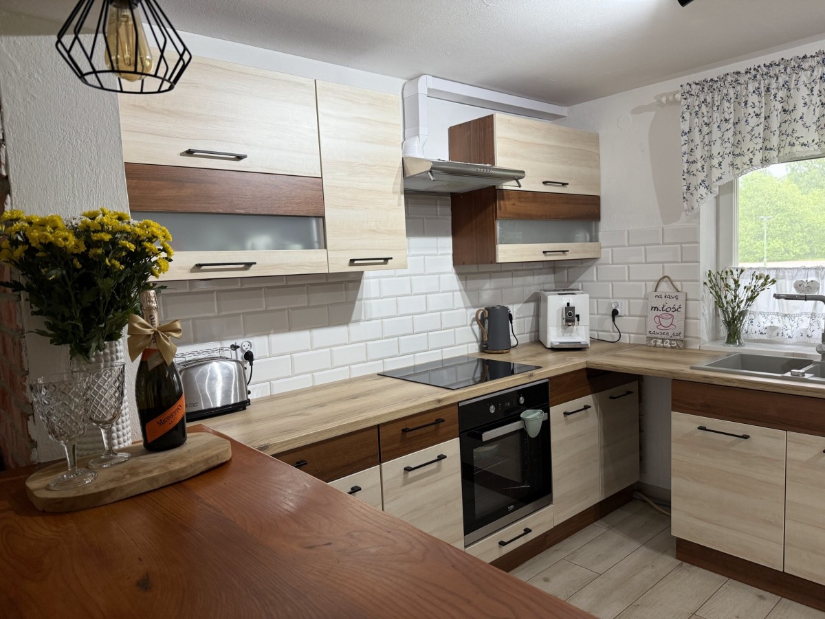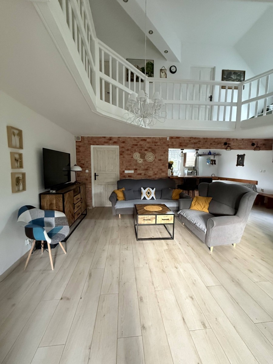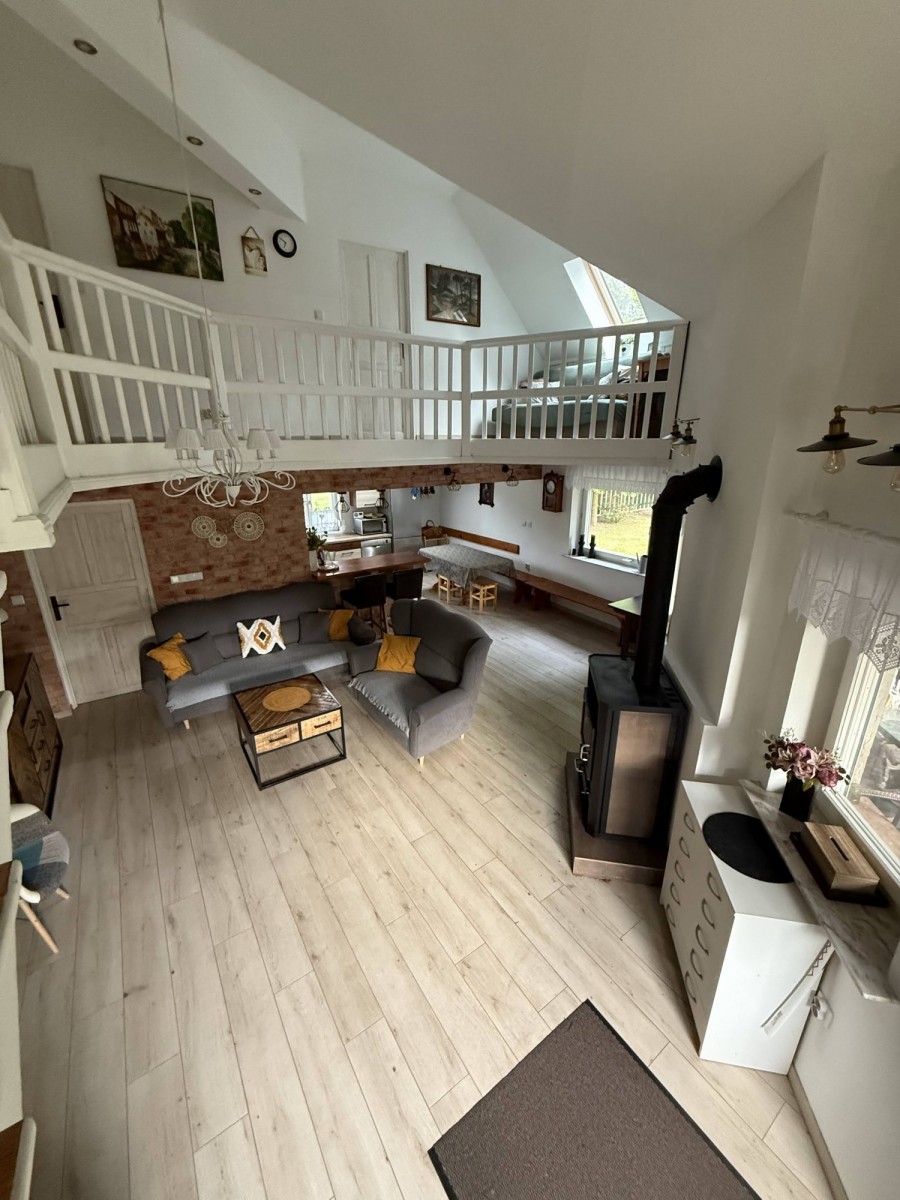 Dom jest przestronny, zadbany i niezwykle przytulny. Dominują jasne barwy, co nadaje ciepła i uroku. Jednym z atutów jest funkcjonalny rozkład pomieszczeń. Serce domu stanowi przestronny, jasny salon połączony z kuchnią. Jest to idealne miejsce na wspólne wieczory przy kominku, rodzinne spotkania i relaks po dniu pełnym przygód. Funkcjonalność parteru uzupełnia sypialnia wraz z łazienką oraz druga łazienka, co pozwala na wygodne życie na jednym poziomie. Na poddaszu znajdują się łazienka oraz trzy sypialnie - jasne i przytulne, a każda z nich stwarza idealne warunki do wypoczynku dla rodziny lub grupy przyjaciół, którzy pragną spędzić niezapomniane chwile w jednym miejscu.
