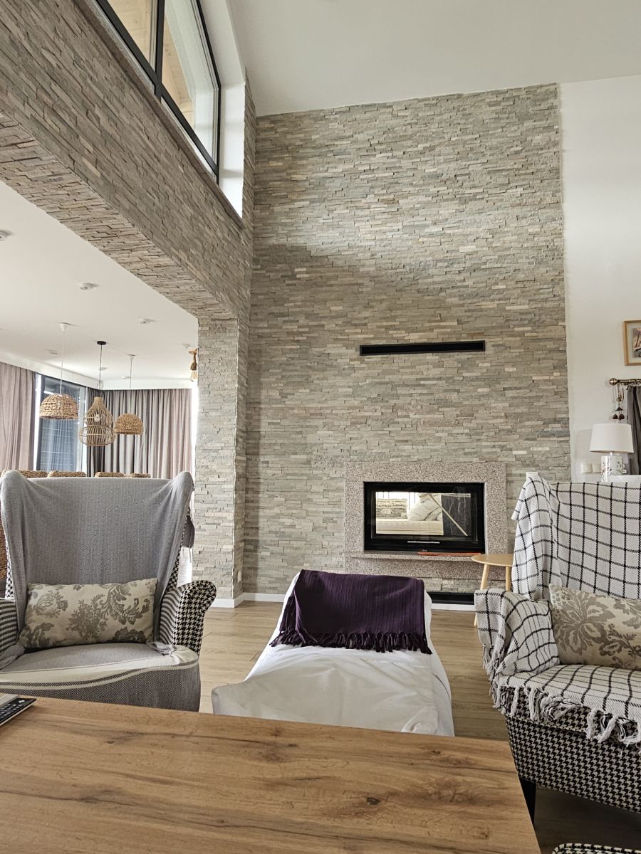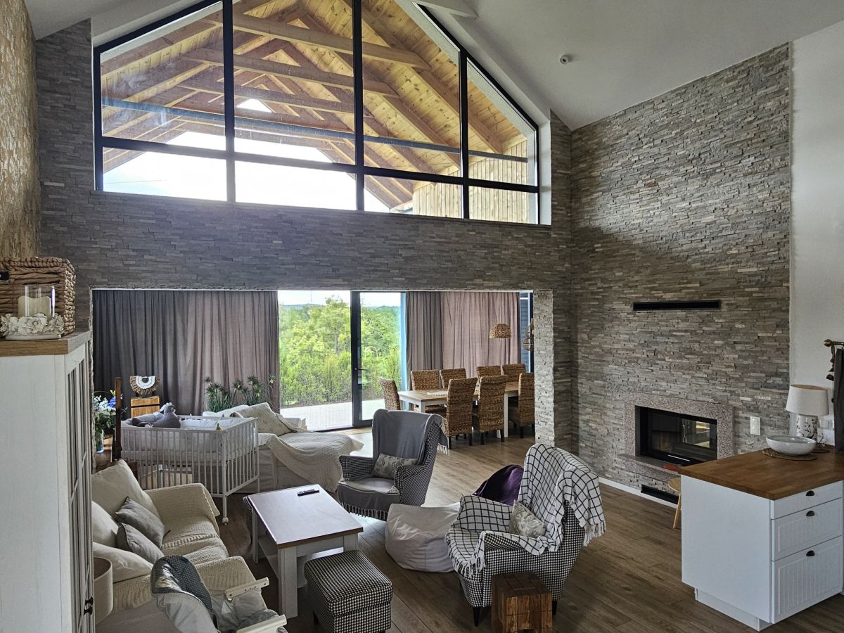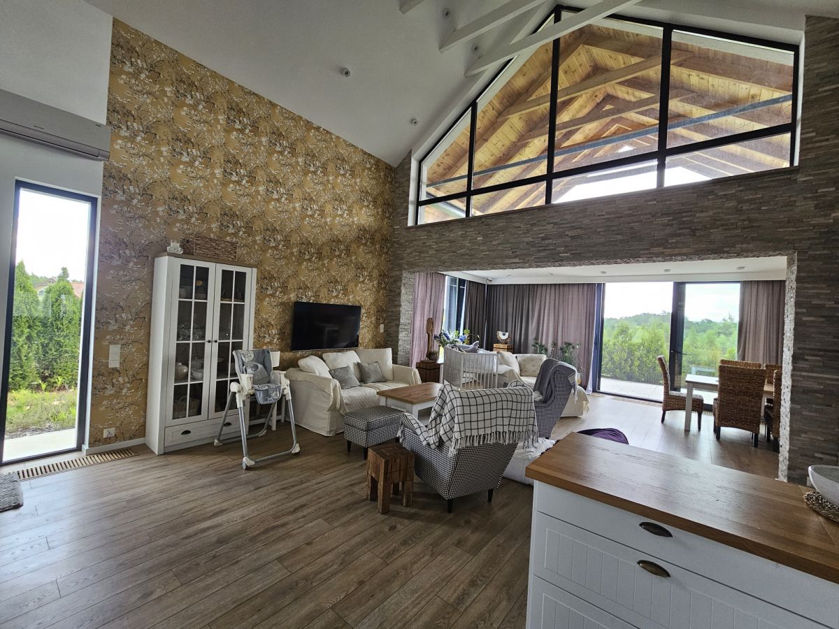 Rewelacyjna oferta - komfortowy, nowy dom położony w województwie warmińsko-mazurskim niecałe 10 km od Mrągowa nad jeziorem Narie. Budynek został posadowiony na skarpie, a ściana okien w salonie o wysokości 5,5 m zapewnia piękny widok na okolicę.