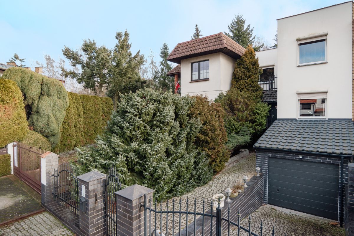 Dom w zabudowie szeregowej - segment środkowy, wybudowany w latach 90., w stabilnym, kameralnym sąsiedztwie. Nieruchomość użytkowana przez obecnych właścicieli od 2014 roku, regularnie modernizowana i utrzymywana w bardzo dobrym stanie technicznym. Podjazd wyłożony kostką granitową, z dodatkowymi miejscami postojowymi przed budynkiem. Spokojna, lokalna ulica o niskim natężeniu ruchu.