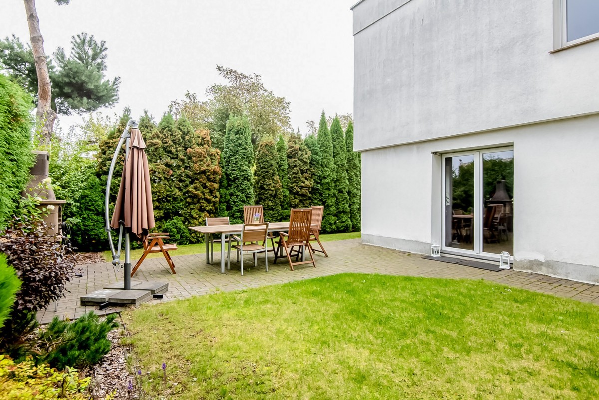 W salonie znajduje się wyjście do ogrodu, który stanowi intymną, prywatną przestrzeń idealną do wypoczynku, spotkań rodzinnych i zabawy dla dzieci, z miejscem na grilla.