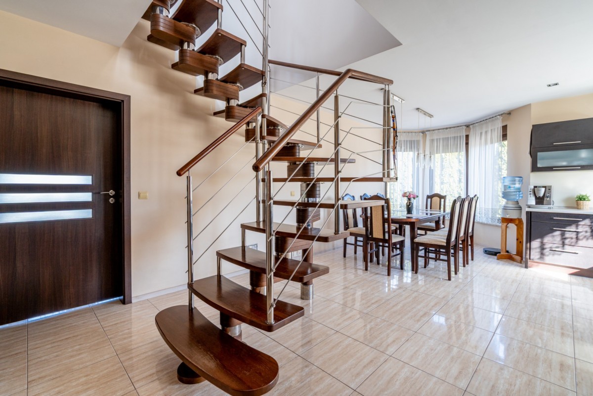 Z parteru na piętro prowadzą kręcone schody z litego dębu.