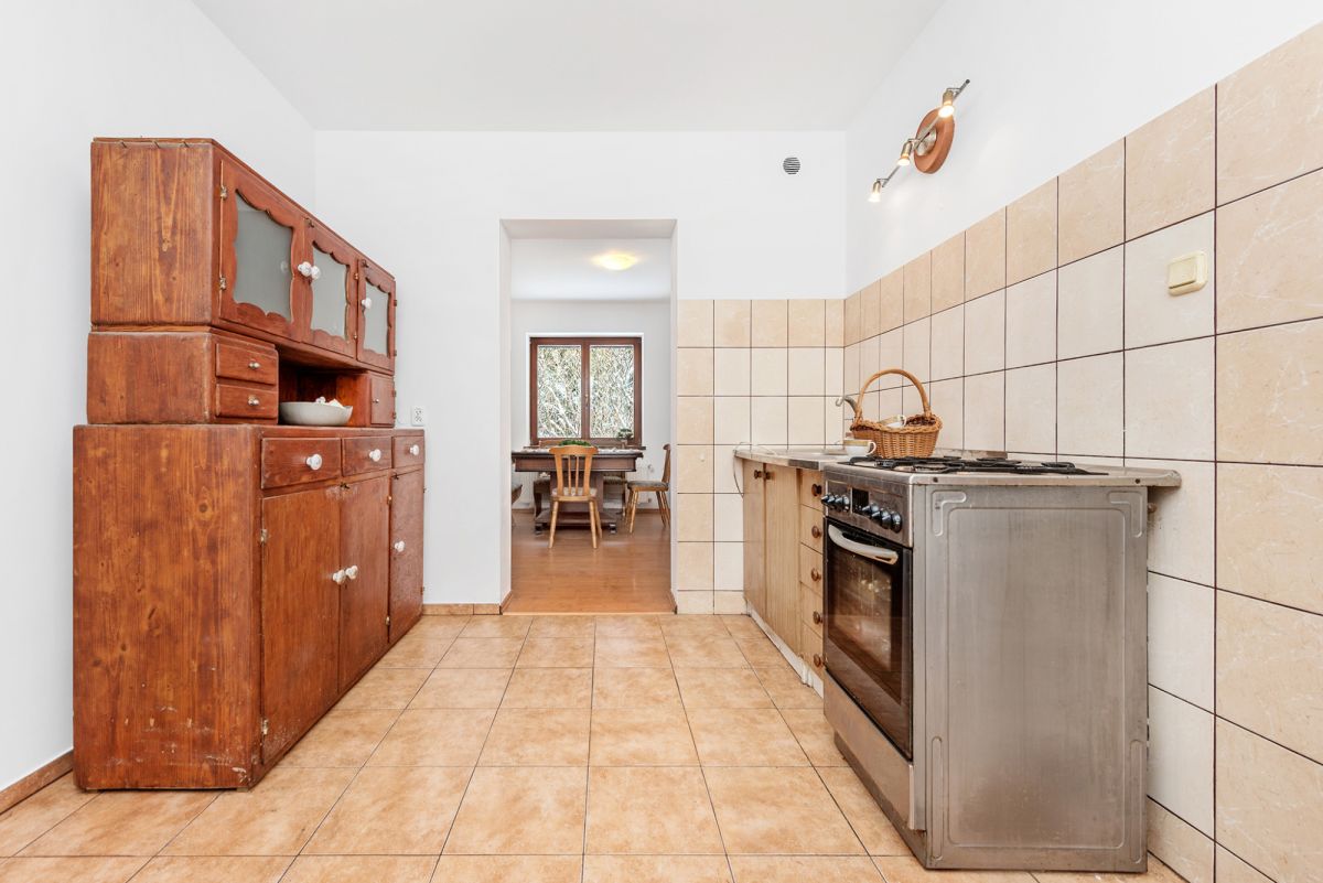 Dom w zabudowie bliźniaczej, ogrodem w otoczeniu zieleni, zapewniającym prywatność i spokój. Budynek posiada przestronną piwnicę o łącznej powierzchni 64,6 m² wraz z kotłownią z piecem gazowym dwufunkcyjnym. . Parter (69,1 m²) jest gotowy do zamieszkania po lekkim odświeżeniu - pomieszczenia są wysokie (2,5 m). Na podłogach wyłożone panele. Kuchnia wyposażona w meble w zabudowie oraz posiada kuchenkę gazowa. Łazienka wyposażona jest w prysznic. Poddasze (68,9 m²) w stanie surowym zamkniętym, o wysokości aż 2,7 m, daje możliwość dowolnej aranżacji według własnych potrzeb i stworzenia komfortowej przestrzeni mieszkalnej, w trakcie adaptacji poddasza na cele mieszkalne, obecnie stan surowy zamknięty do wykończenia.