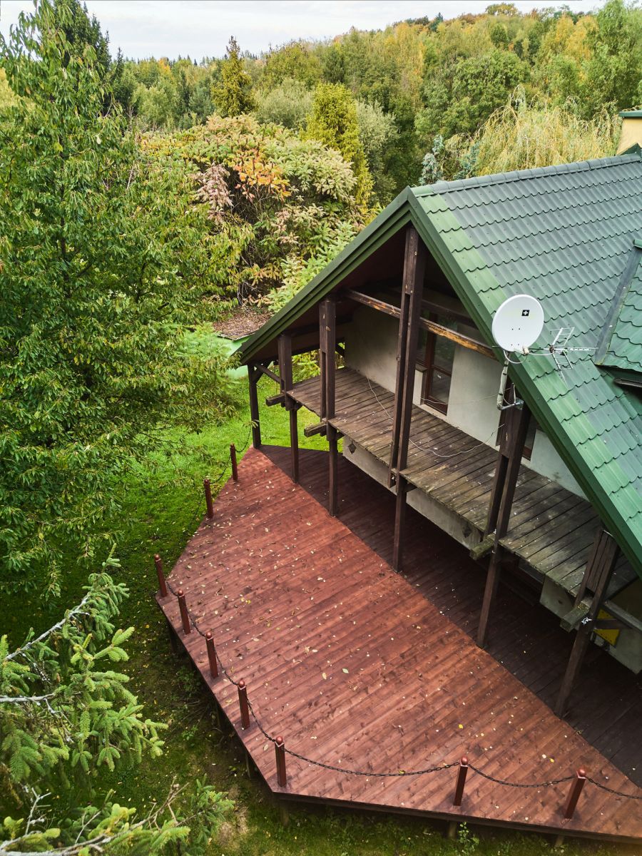 Dom o powierzchni 202,60 m² z pięknym tarasem o pow. 31,5m, na stronę zachodnią, oraz tarasem drewnianym okalającym cały budynek. Wyposażony w okna PCV.