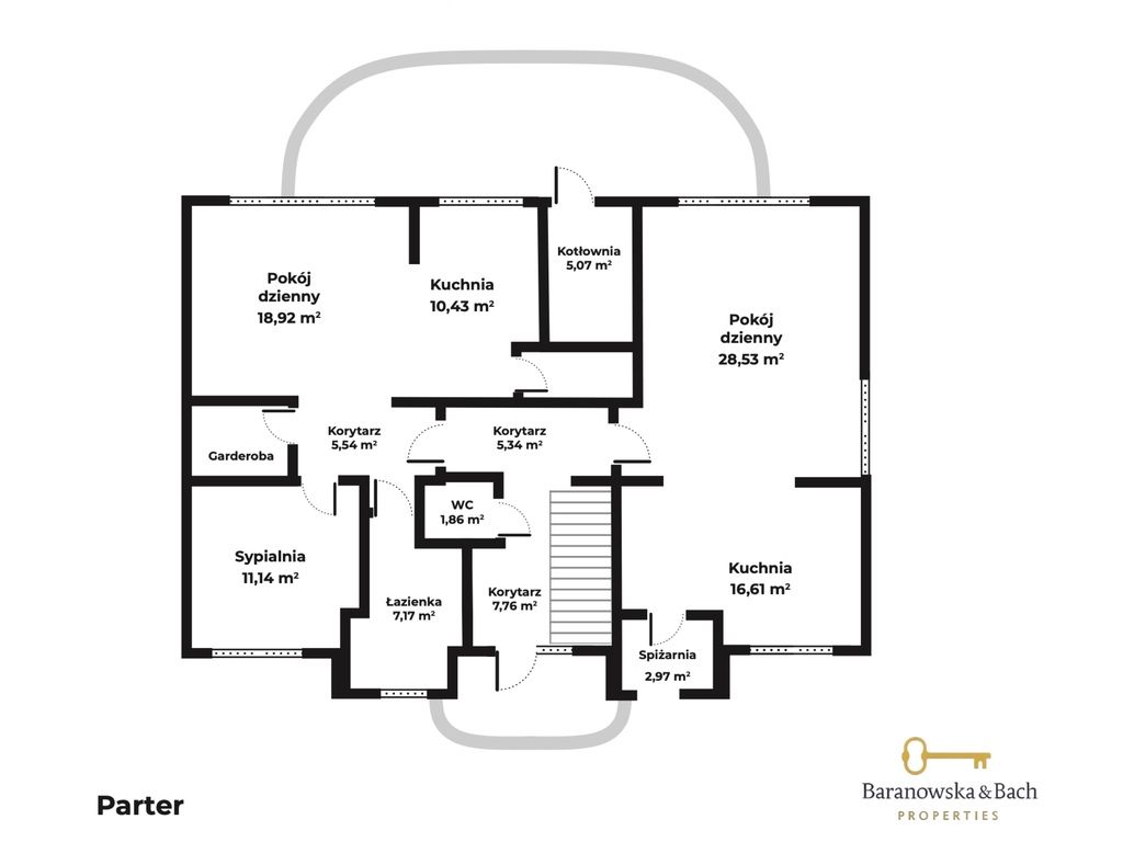 Rozkład pomieszczeń:Parter (123 m²): 1) Przestronny salon (30 m²), kuchnia (17 m²z) ze spiżarnią (3 m²), WC (2 m²), kotłownia (5 m²), przedpokój z klatką schodową (8 m²), korytarz (5 m²).