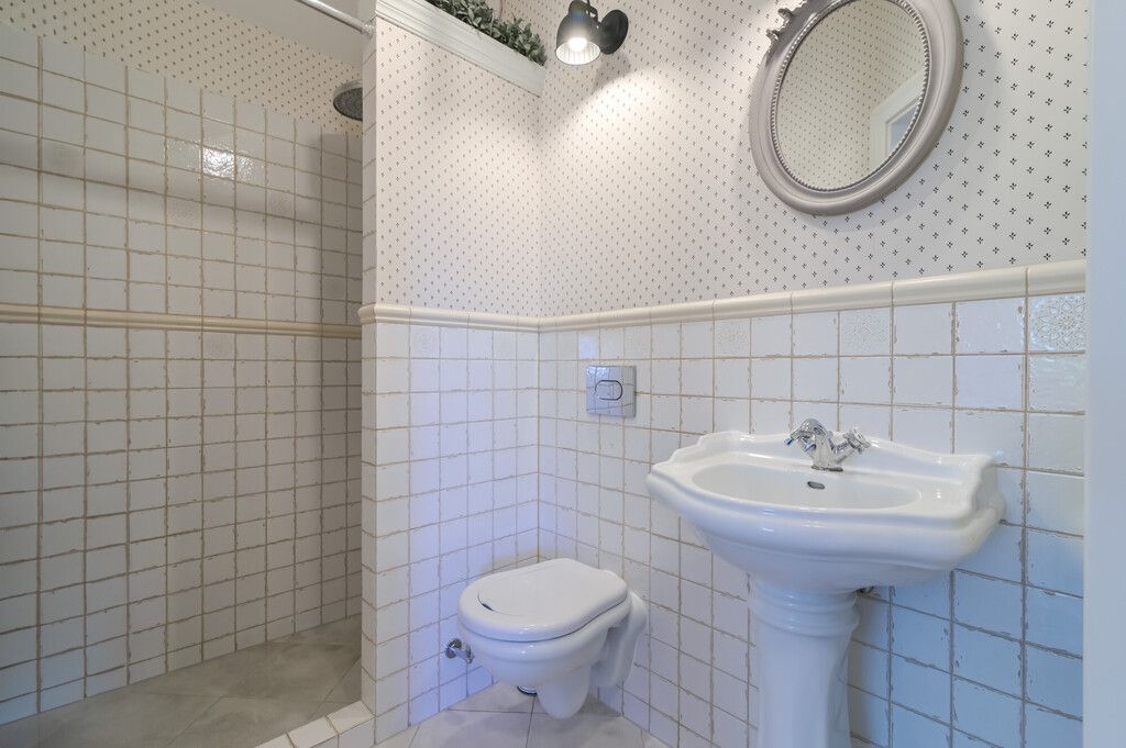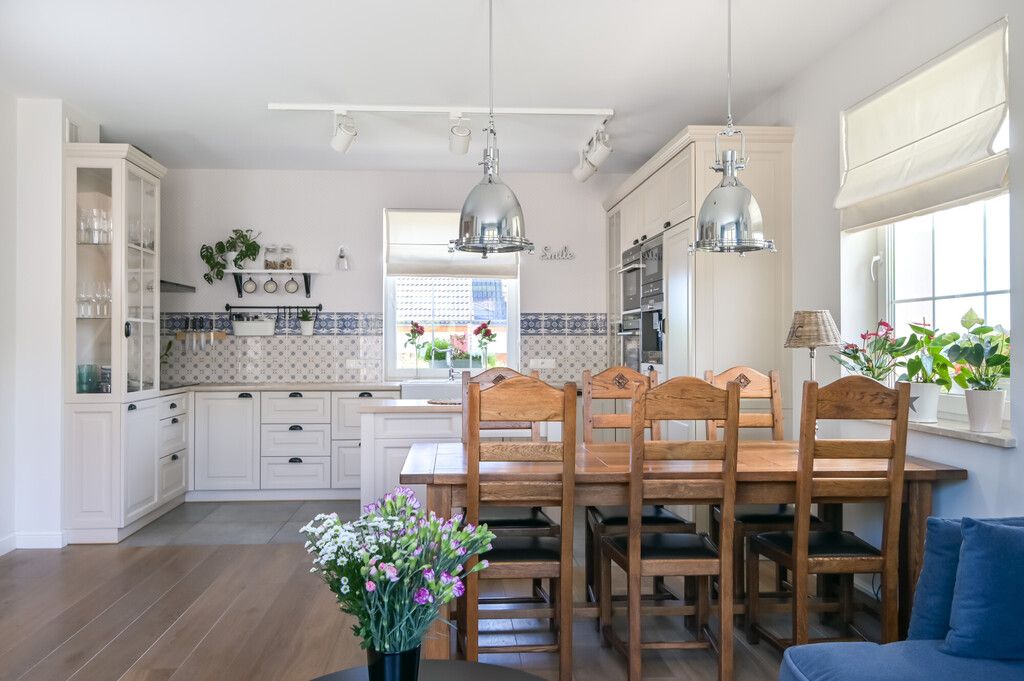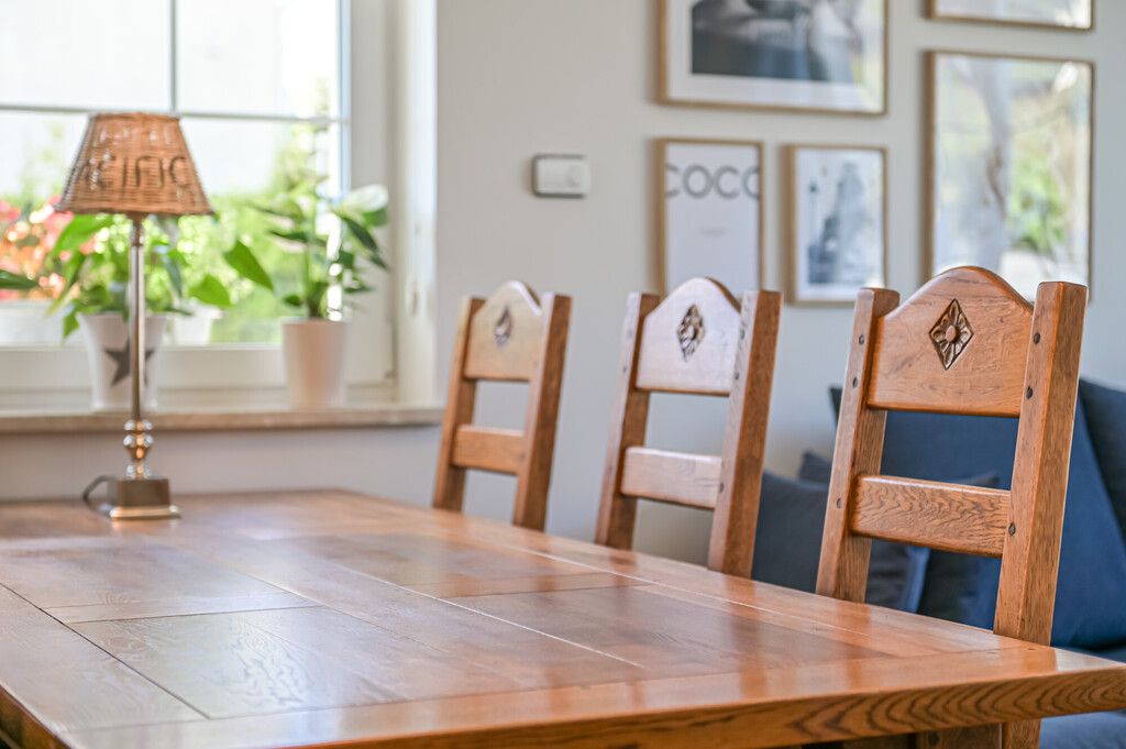 W tej części domu mieści się także w pełni wyposażona, stylowa kuchnia wraz z jadalnią. Dolną łazienkę, dla wygodny mieszkańców, wyposażono w prysznic oraz toaletę.