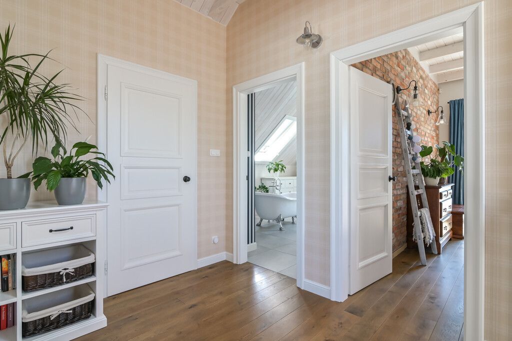 Nie sposób oprzeć się klimatowi tego domu. Przyjemne barwy drewnianej podłogi oraz schodów i podsufitowych desek, w połączeniu z kolorami i wzorami ścian, przywołują na myśl ducha angielskich, gustownych wnętrz.