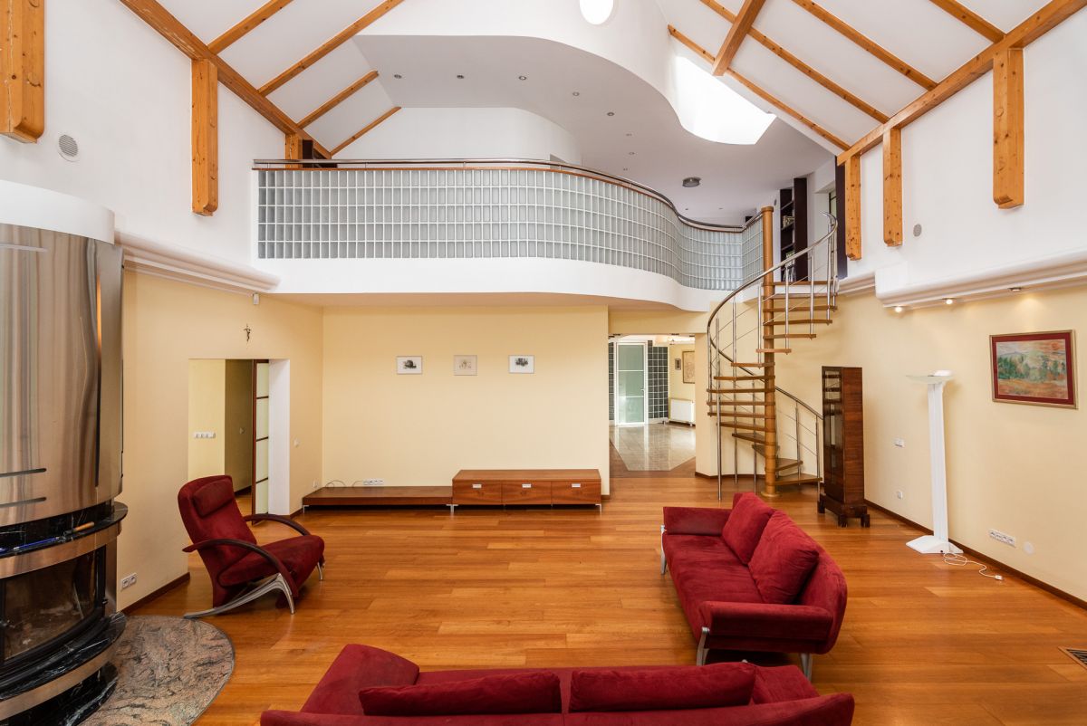 Na poddasze prowadzą drewniane schody zarówno z salonu jak i przedpokoju. Nad pokojem dziennym znajduje się antresola ze stołem bilardowym oraz biblioteką.