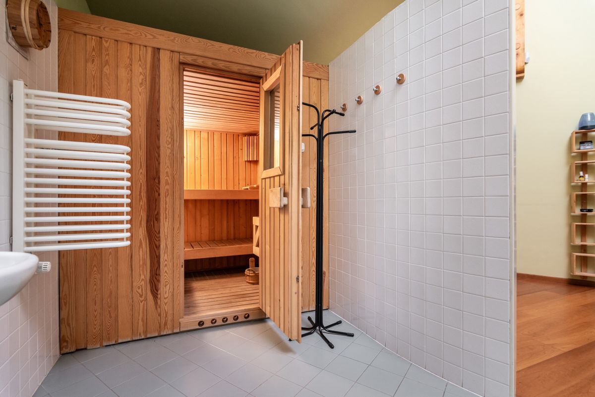 Na parterze znajduje się przestronny salon z kominkiem, kuchnia ze spiżarnią, wydzielona jadalnia z wyjściem na taras, pokój rekreacyjny (gimnastyczny) połączony z sauną, gabinet, toaleta, sypialnia z łazienką, pralnia, suszarnia oraz garderoba.