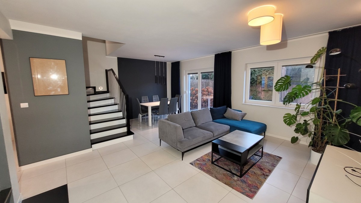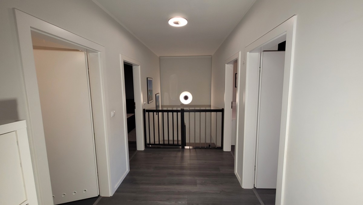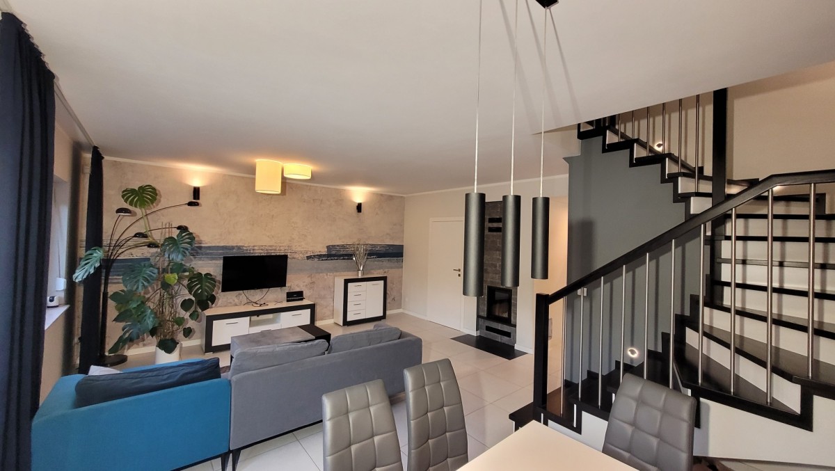 - na podłodze płytki na parterze + łazienka na piętrze, panele na piętrze