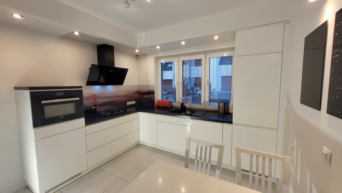 - zabudowa kuchni - zmywarka 60 cm, piekarnik, lodówka - firmy Beko, okap - firmy Faber