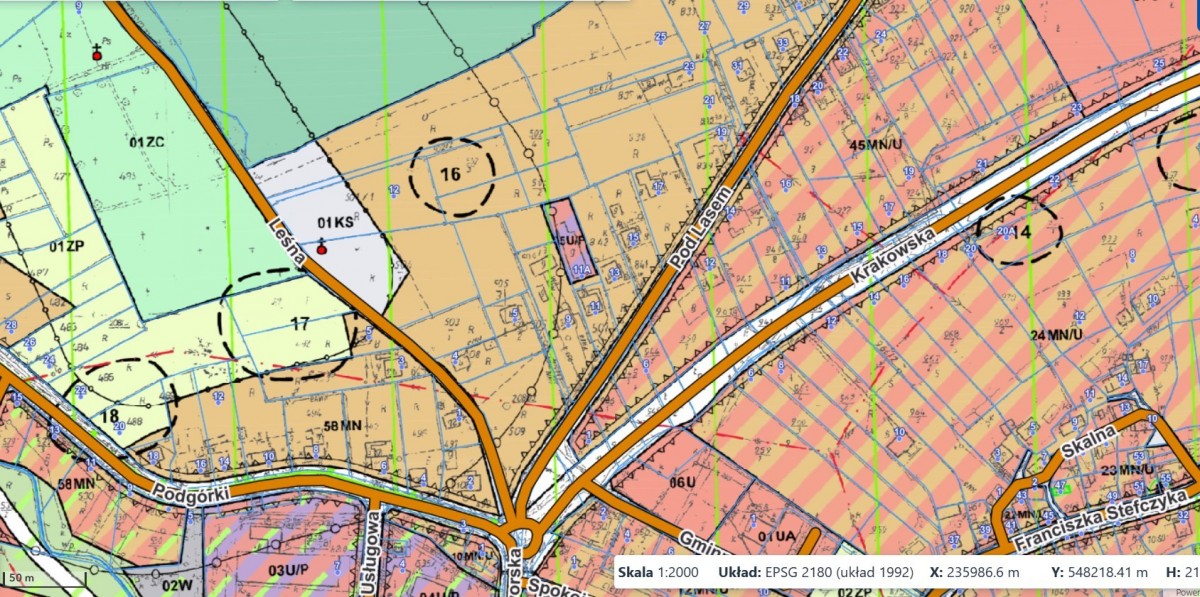 Oferowana na sprzedaż działka ma ok.2198 m2. Składa sie z dwóch mniejszych działek 1242 i 956 m2. Przeznaczenie działki w MPZP: 59MN, budowlana - tereny zabudowy mieszkaniowej jednorodzinnej w układzie wolnostojącym lub bliźniaczym. Kształt prostokąta około 50 metrów x 45 metrów. Media: Woda jest na działce, prąd także-pod 4 mieszkania, reszta - do przyłączenia, bezpośrednio przy działce. Maksymalna wysokość zabudowy to 9 metrów. Minimalny wskaźnik powierzchni biologicznie czynnej - 50%. PUM ok.800m2.