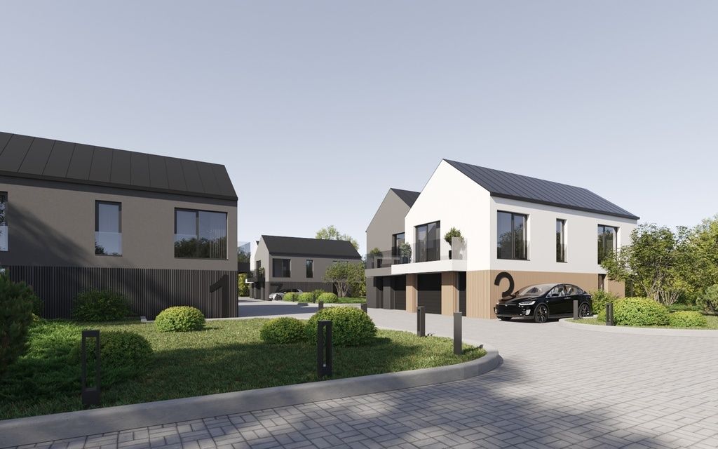 Projekt budowlany zakłada dużą działkę dla każdego budynku, dodatkowo przewidziano teren wspólny i parking dla gości.
