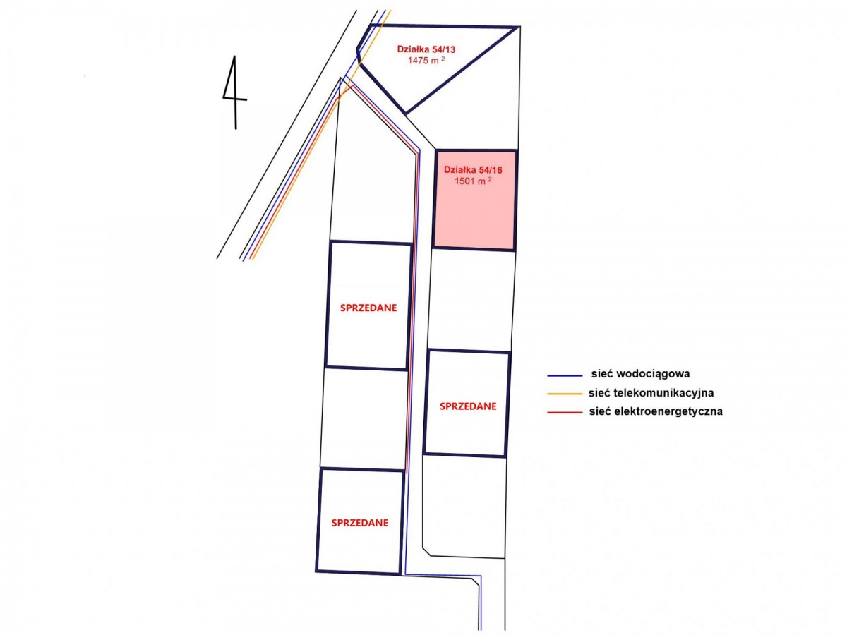 W drodze wewnętrznej, bezpośrednio przy działce znajduje się sieć wodociągowa, energetyczna, światłowodowa.