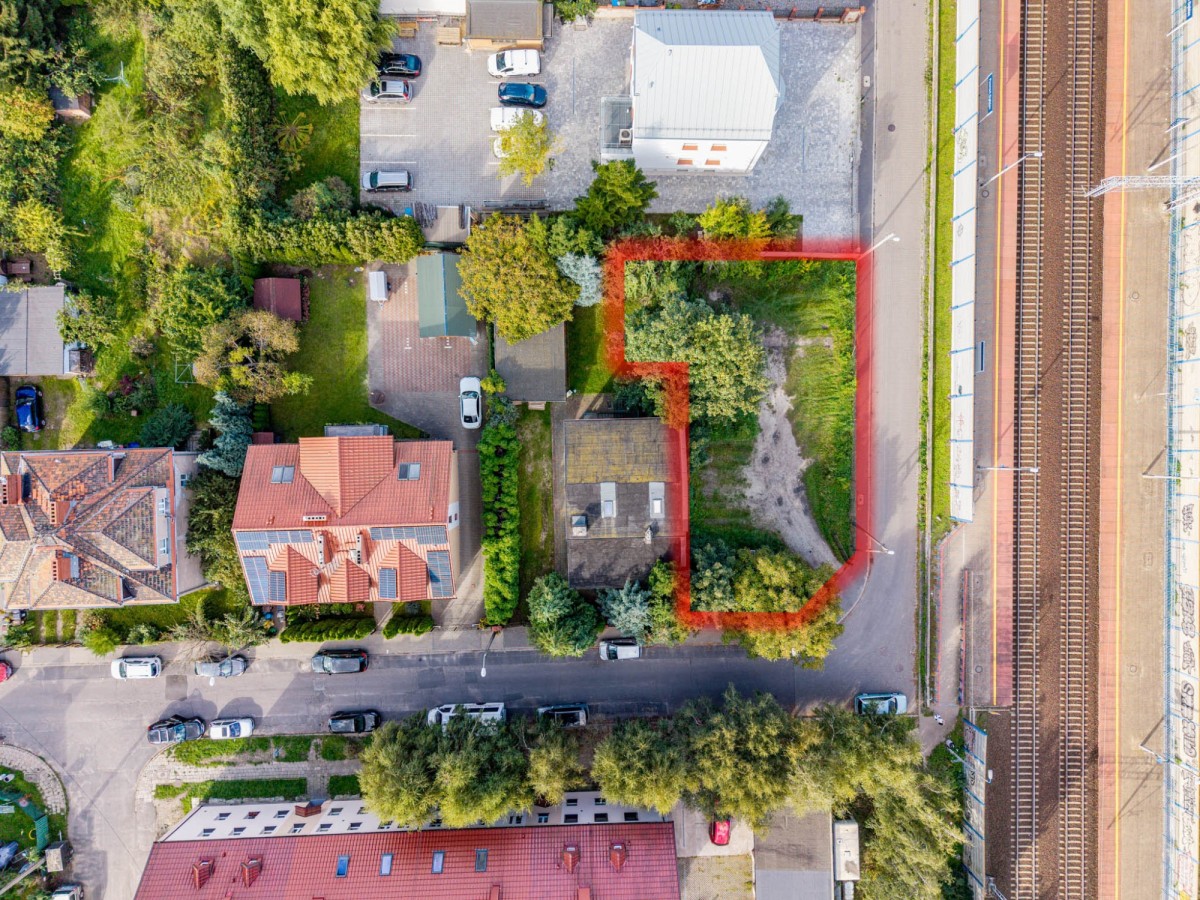 Działka o powierzchni 608 m2 - na zdjęciach oznaczona kolorem czerwonym.