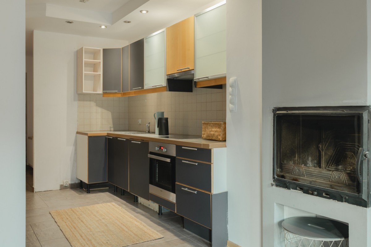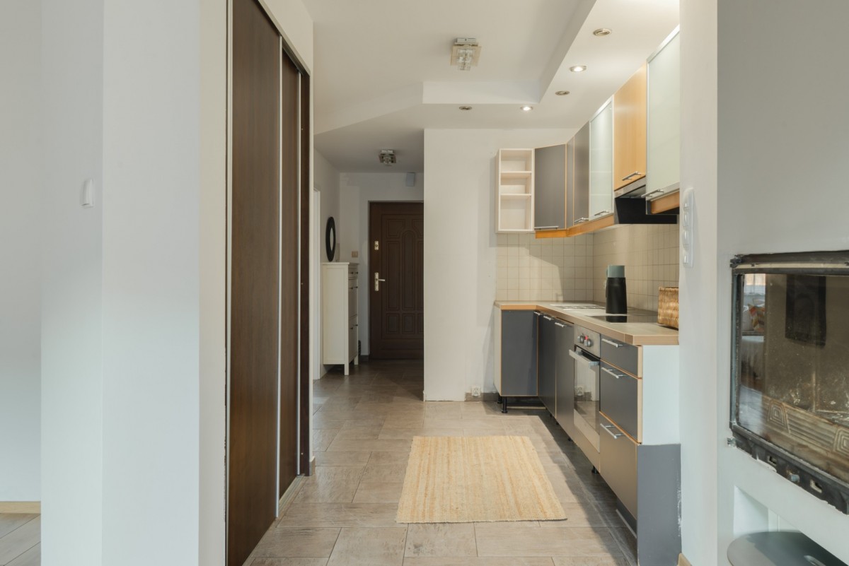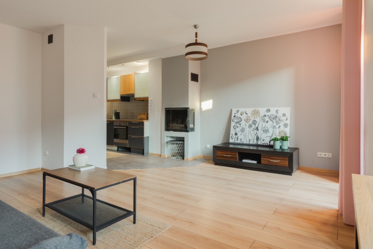Dodatkowym atutem jest kominek w salonie, który nadaje wnętrzu przytulny charakter i może pełnić funkcję dodatkowego źródła ciepła.