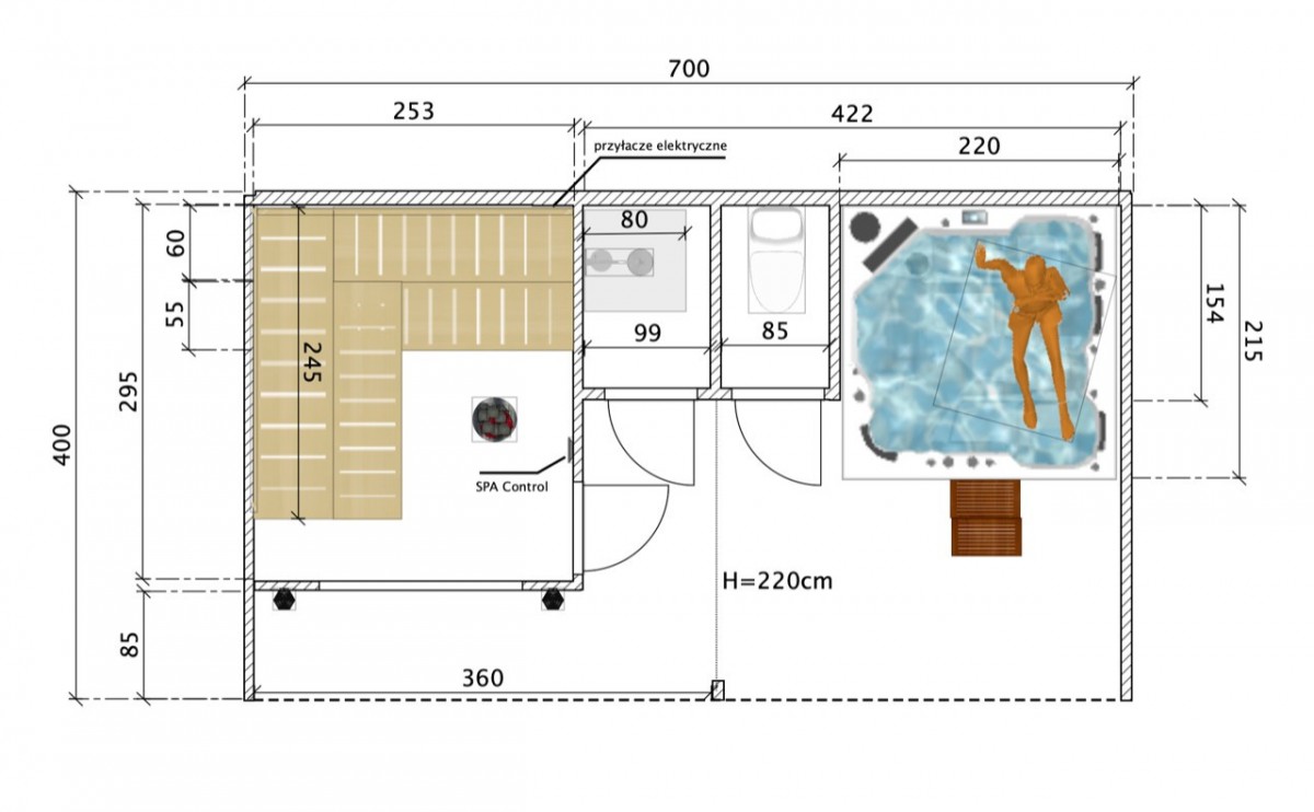 * zdjęcie sauny wygenerowane poglądowo - wolnostojący budynek z sauną i jacuzzi jest obecnie w trakcie realizacji (projekt w załączeniu).