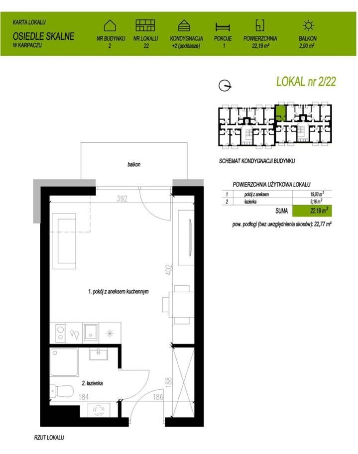 Lokal o powierzchni 22,19 m², usytuowany jest na drugim piętrze w apartamentowcu z windą, którego budowa zakończyła się w 2025 roku.