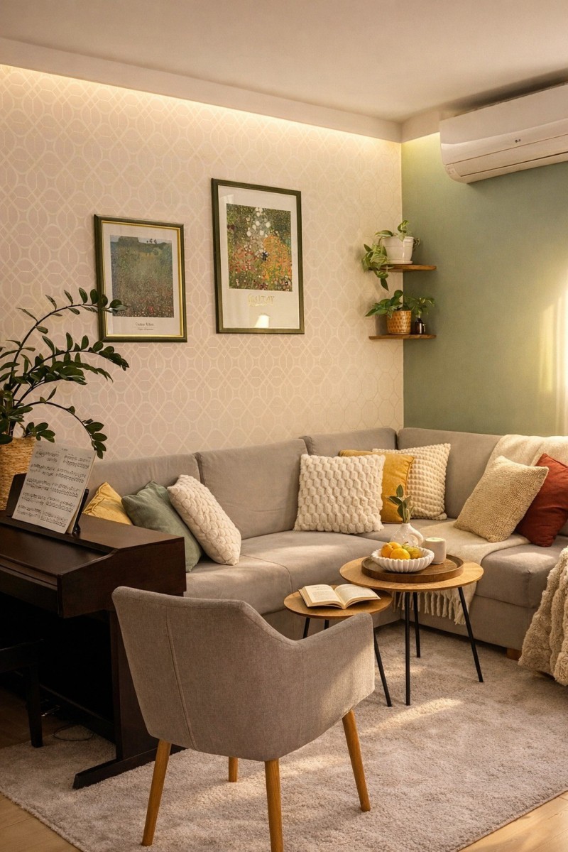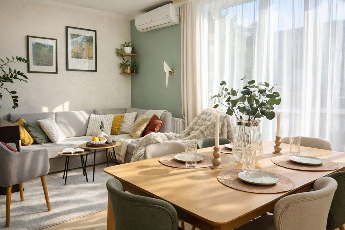 Rolety zewnętrzne w salonie i sypialni. Roleta rzymska, rolety zaciemniające i wentylator sufitowy w pokoju nr 2.