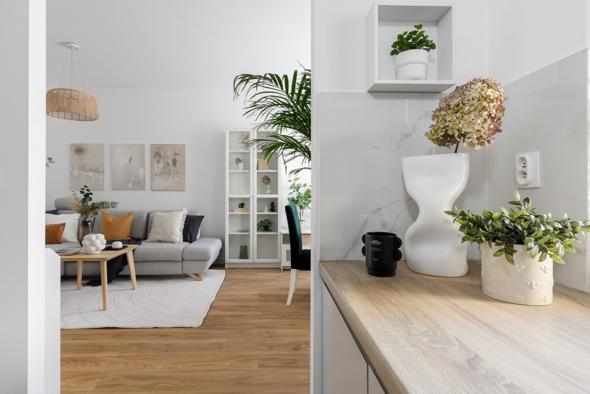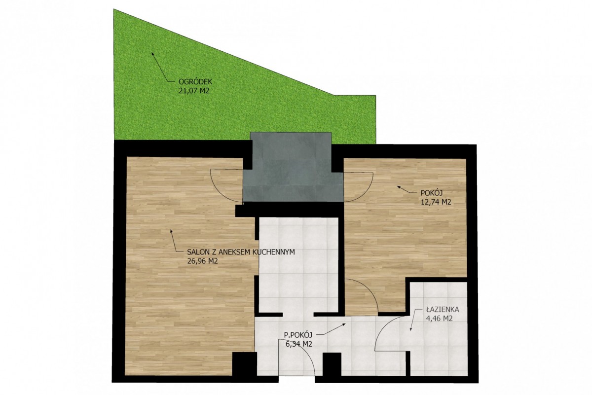 Z salonu i z sypialni wyjście na prywatny ogródek, stanowiący naturalne przedłużenie strefy dziennej.
