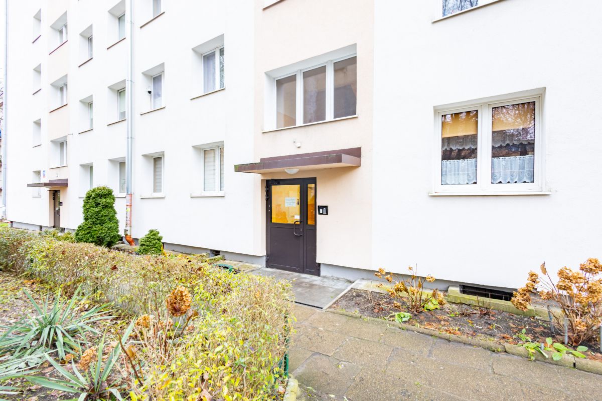 To czteropiętrowy blok z cegły z końcówki lat 50., po pełnej termomodernizacji. Elewacja została wykonana w zeszłym roku, dzięki czemu budynek prezentuje się świeżo i estetycznie. Przy bloku znajdują się miejsca parkingowe dla mieszkańców oraz zielony teren prowadzący w głąb osiedla.