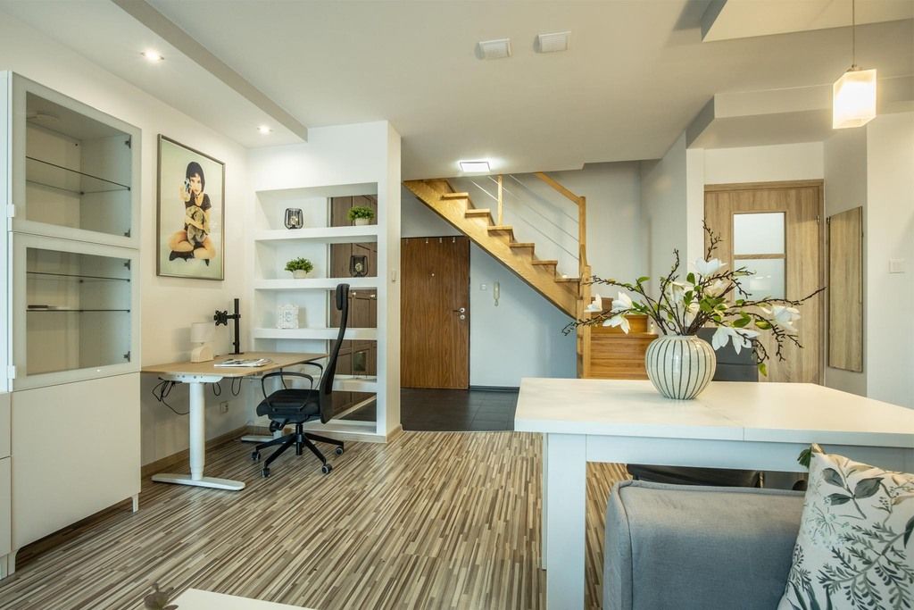 Dodatkowym atutem jest większa powierzchnia podłóg – przekraczająca 80 m² – co daje szerokie możliwości aranżacyjne, również pod skosami.
