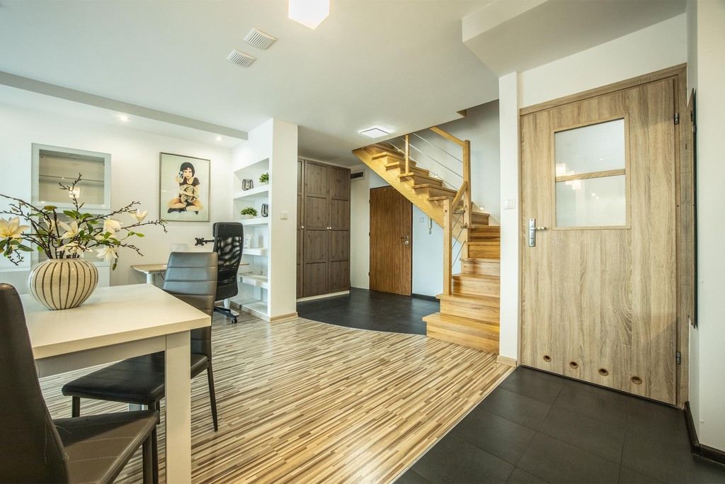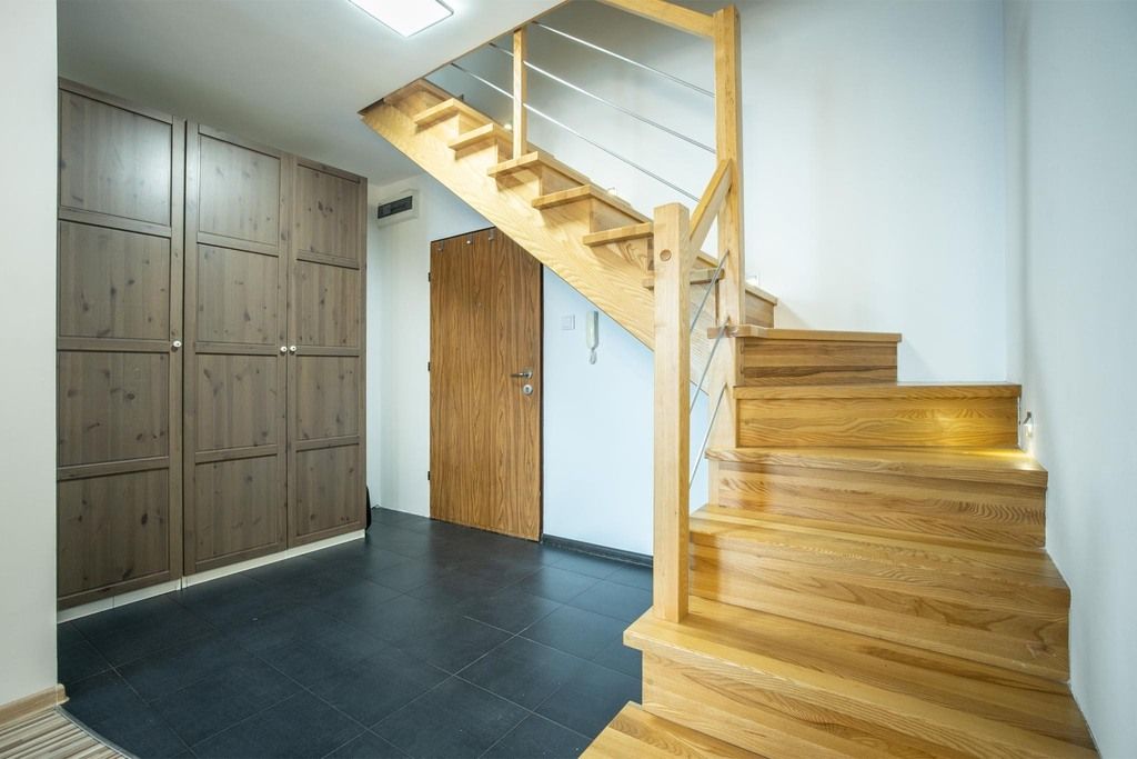 Na drugi poziom prowadzą estetyczne, drewniane schody.