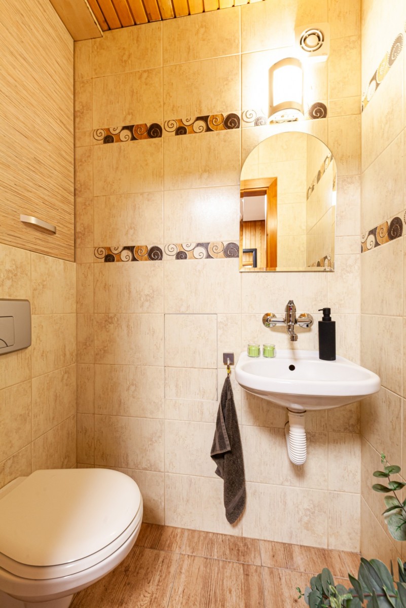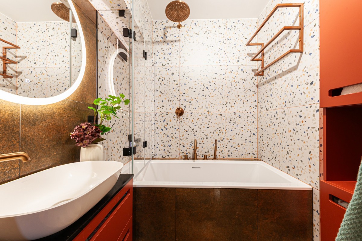 Łazienka i oddzielne WC to układ, który doceni się dopiero w praktyce, zwłaszcza o poranku. Nowoczesne oświetlenie, wanna z prysznicem, w której można naprawdę odpocząć, funkcjonalne rozwiązania — tutaj po prostu chce się zatrzymać na chwilę dłużej.