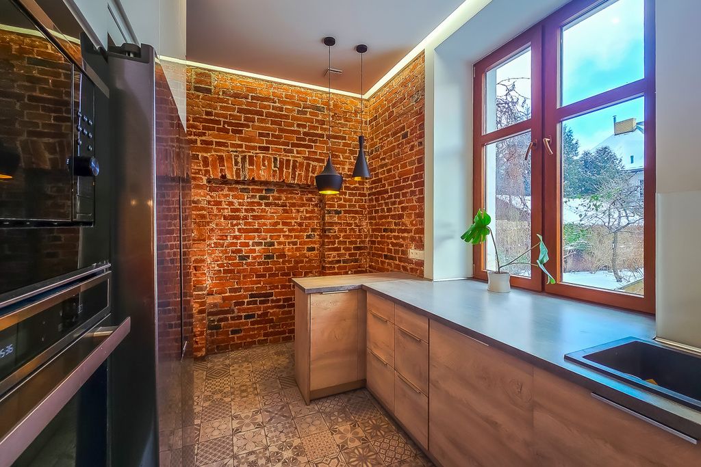 Zagospodarowana każda wolna przestrzeń oraz sprzętem AGD takimi jak lodówka z zamrażarką duża dwudrzwiowa, zmywarka, okap, piekarnik i mikrofalówka w zabudowie, duży blat i duże okno na ogród. Łazienka z oknem wyposażona w prysznic typu walk-in, pralkę, umywalkę, WC oraz grzejnik drabinkowy.
