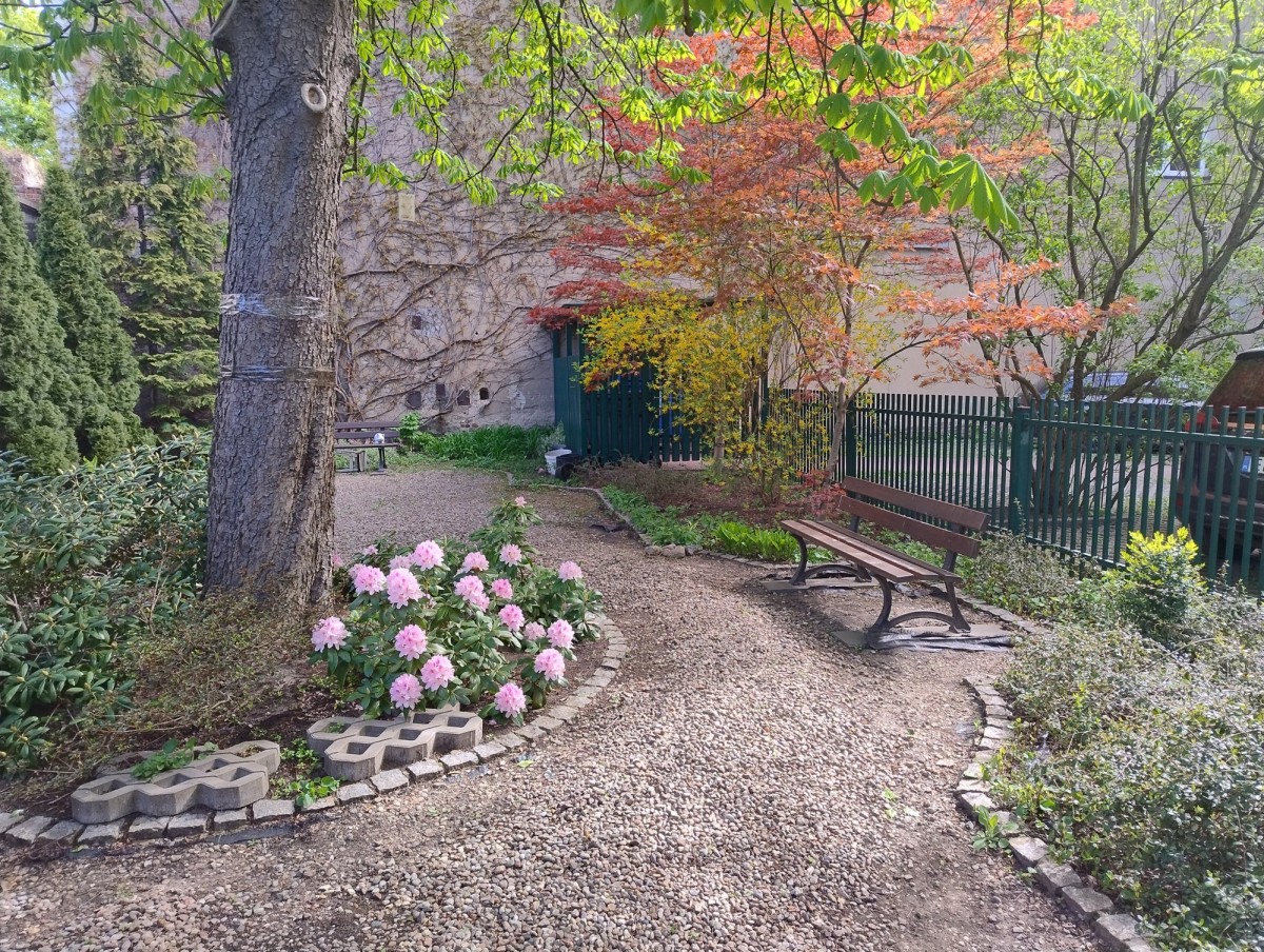 dla mieszkańców wydzielony ogródek z ławeczkami