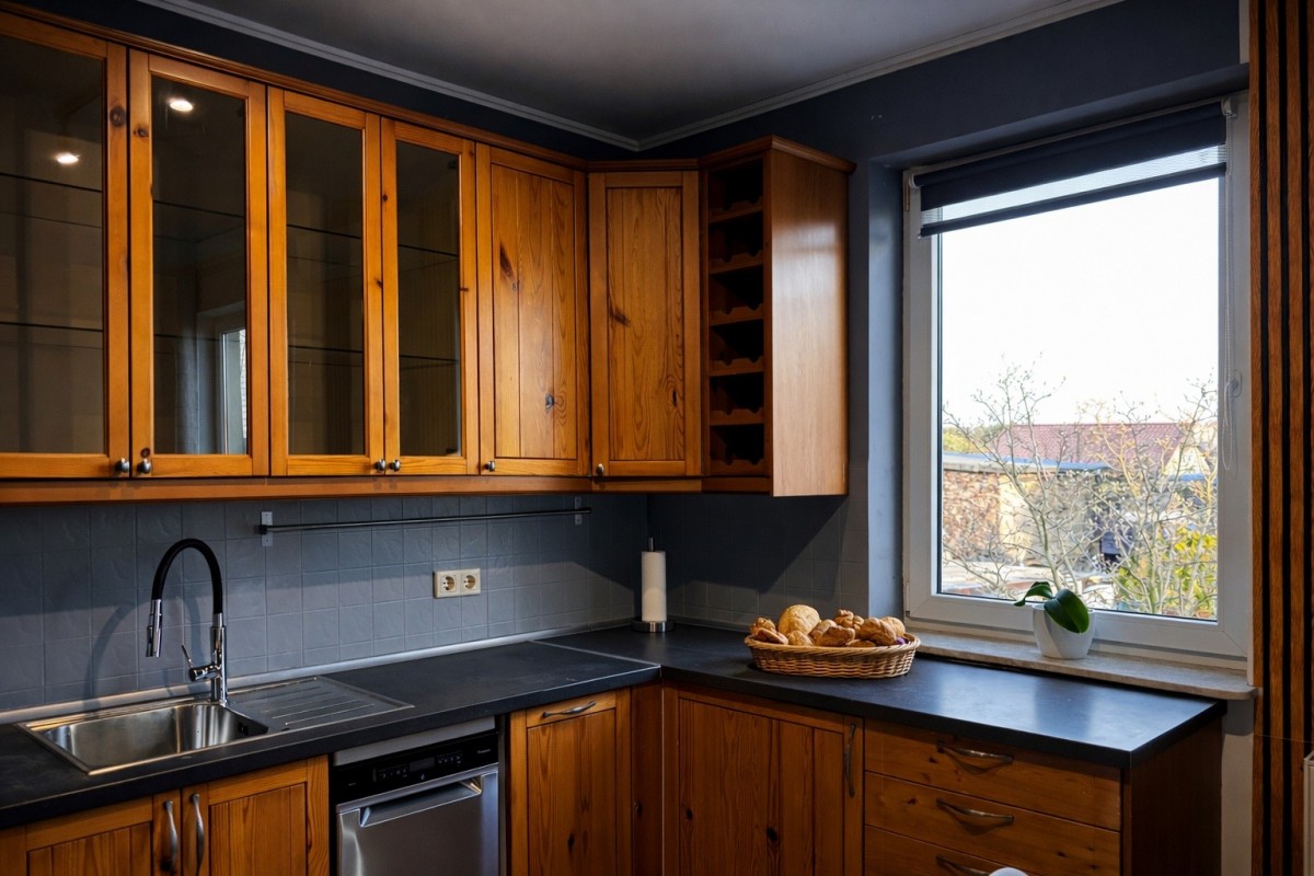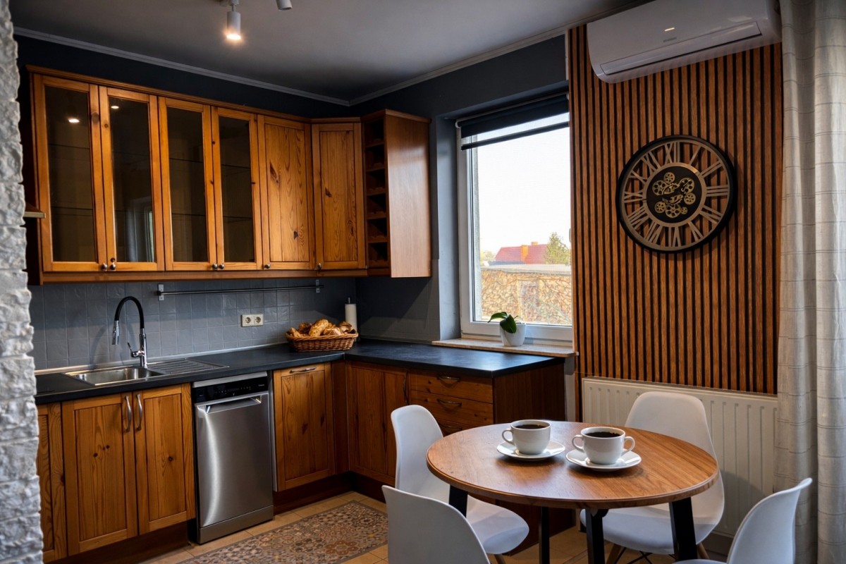 - kuchnia wyposażona w meble w zabudowie oraz sprzęt AGD
