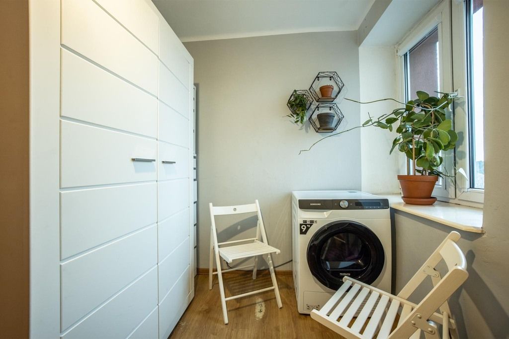Mieszkanie charakteryzuje się niezwykle przemyślanym rozkładem. Mimo kompaktowego metrażu, wydzielenie