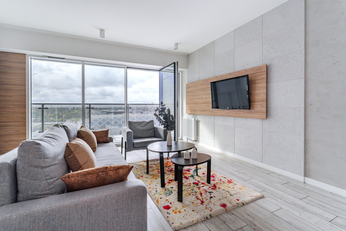 Wnętrze zostało zaprojektowane z dbałością o każdy detal - elegancka strefa dzienna z panoramicznymi oknami tworzy przestrzeń pełną światła i energii. Z balkonu rozciąga się widok na tętniące życiem centrum miasta.