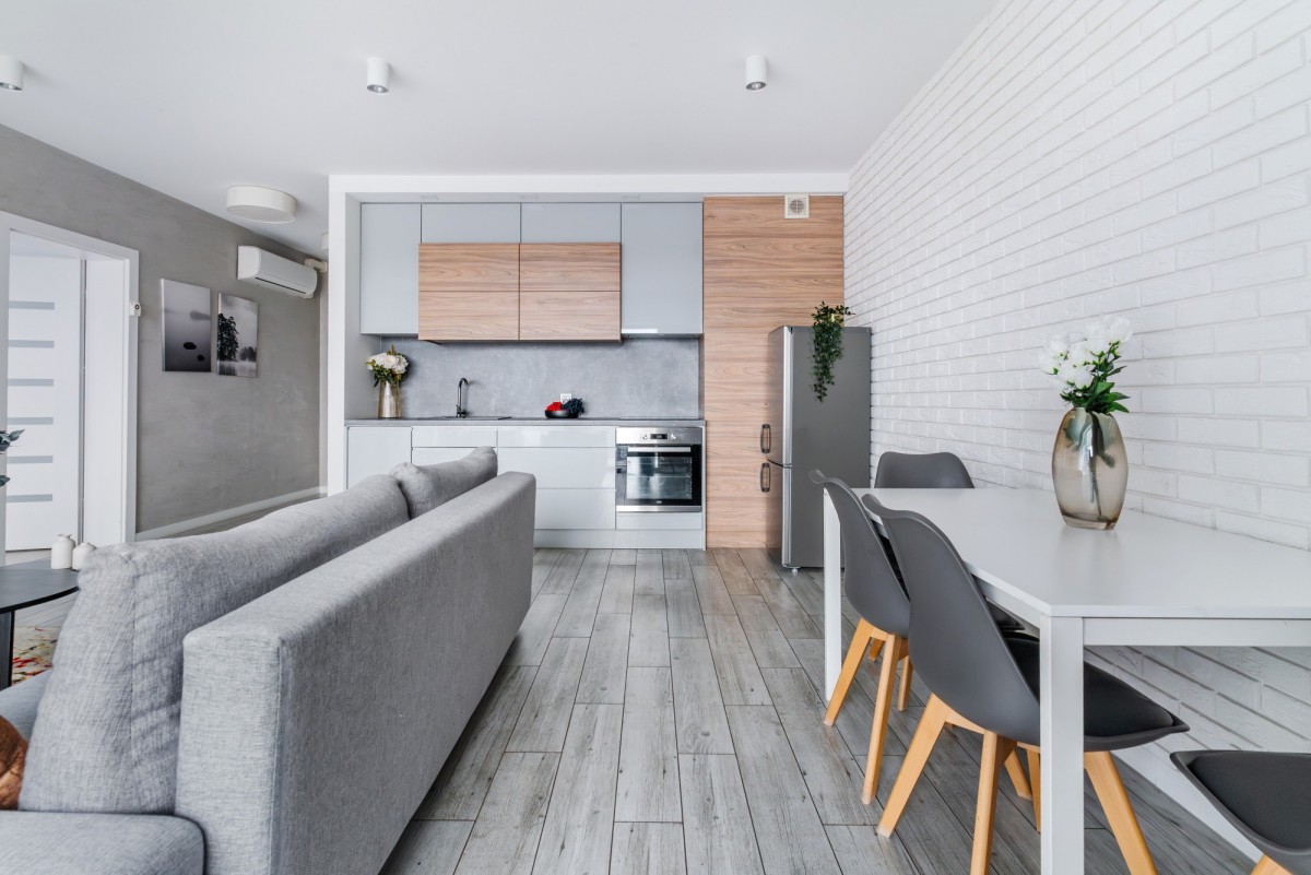 • Salon z aneksem kuchennym i wyjściem na balkon.