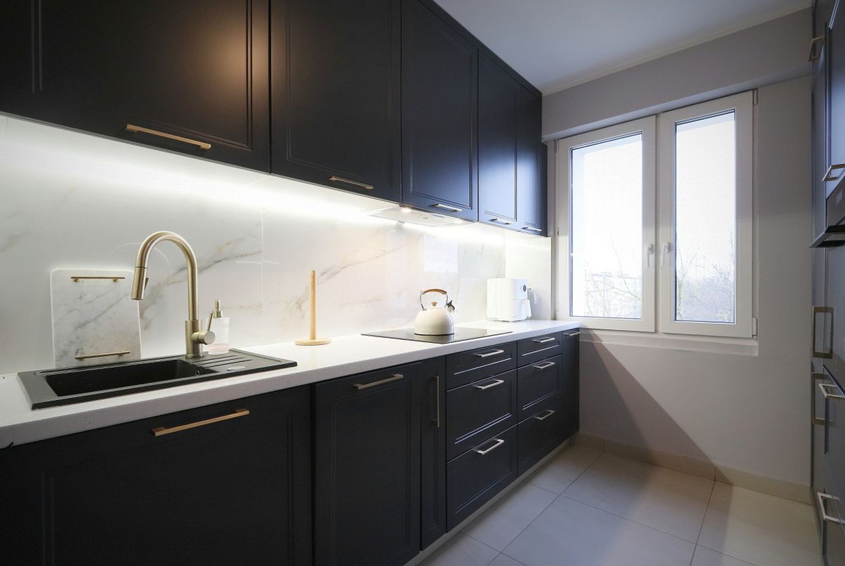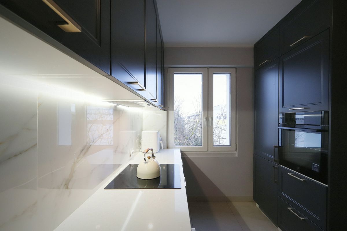 Kuchnia oddzielna, z elegancką zabudową i pełnym wyposażeniem (m.in. zmywarka, płyta, piekarnik). Zachowana została w spójnym, nowoczesnym stylu.