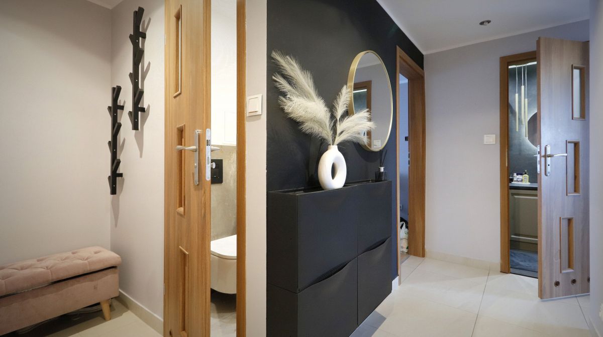 Mieszkanie ma układ, który zapewnia wyraźny podział na strefę dzienną i prywatną. Korytarz prowadzi wygodnie do wszystkich pomieszczeń, a każdy pokój ma pełną niezależność. Całość jest bardzo czytelna i komfortowa w codziennym użytkowaniu.