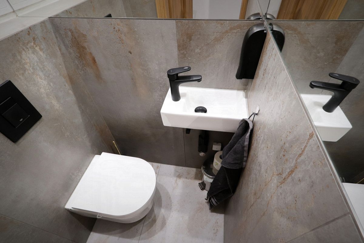 Łazienka jest wykończona w eleganckim, nowoczesnym stylu, z prysznicem. Oddzielna toaleta..