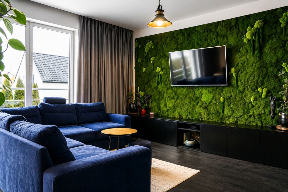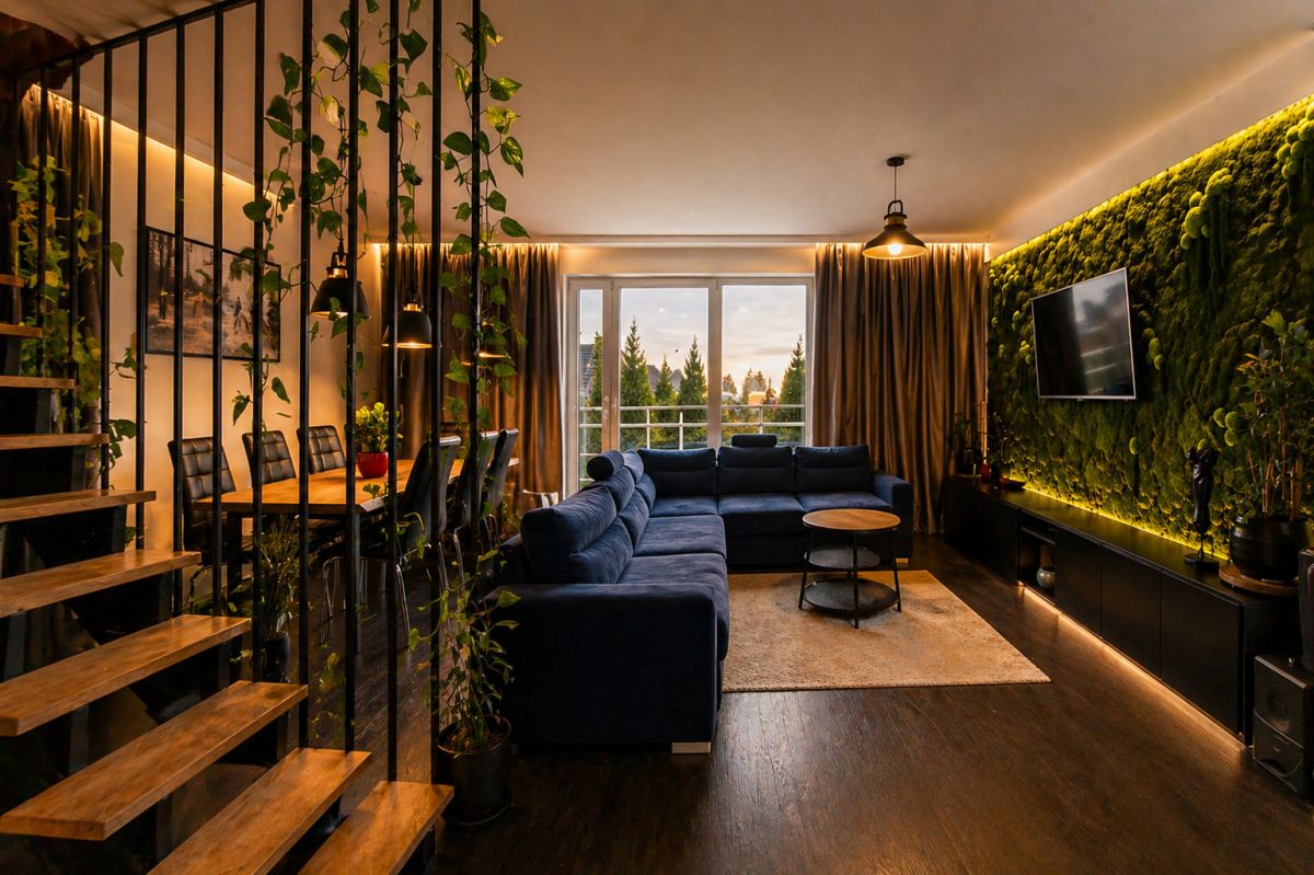 Pełne, efektowne przeszklenia zapewniają doskonałe doświetlenie wnętrza przez cały dzień. Centralnym elementem salonu jest ściana z żywego mchu — designerski detal, który podnosi reprezentacyjność wnętrza i nadaje mu wyjątkowy charakter.