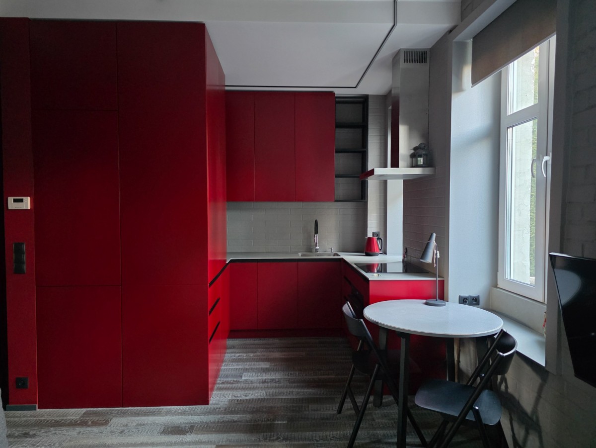 - Układ: pokój z aneksem kuchennym, przedpokój oraz łazienka z WC, wysokie - podwieszany sufit na wysokości 2,91 m