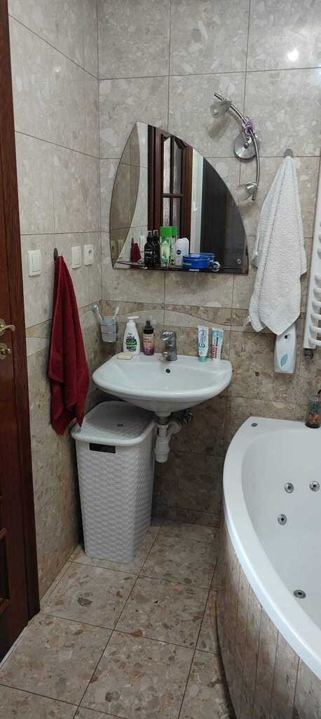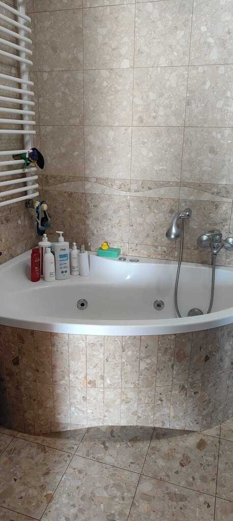 *łazienka nowoczesna, wykończona płytkami, z wanną z hydromasażem, prysznicem i pralką.