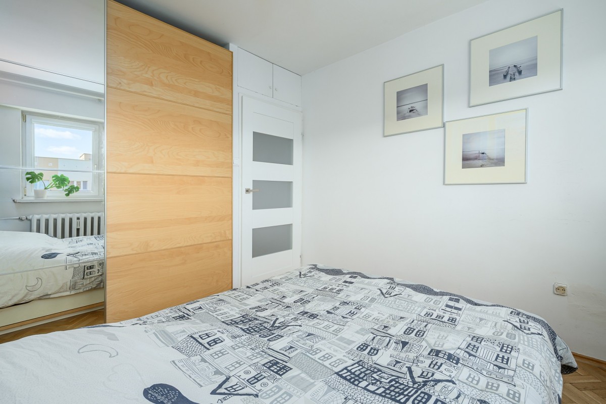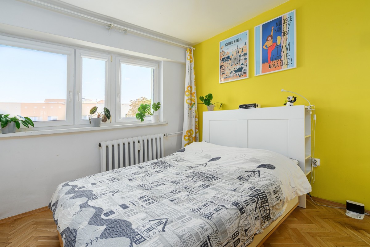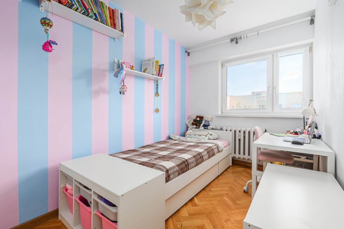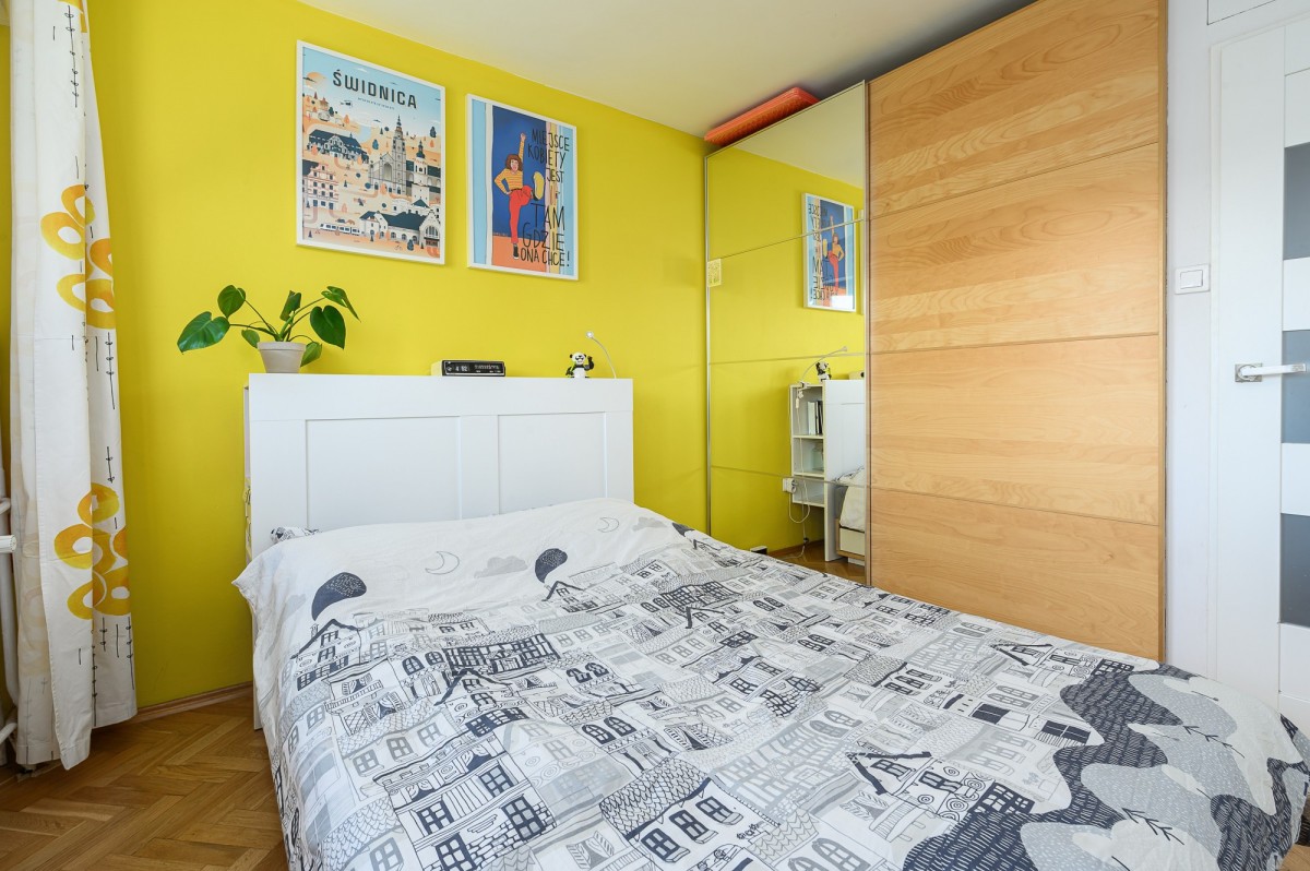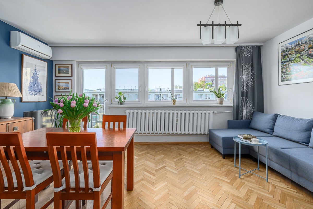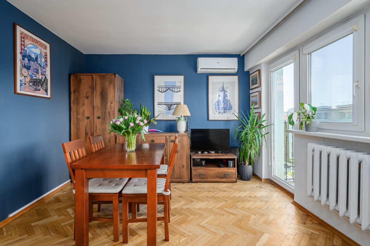Mieszkanie składa się z pokoju dziennego o ekspozycji zachodniej połączonego z aneksem kuchennym oraz wyjściem na mały balkon. W dalszej części mieszkania znajdują się dwa oddzielne pokoje o ekspozycji wschodniej. Łazienka z prysznicem oraz miejscem na pralkę. Przedpokój bez możliwości zaaranżowania szafy do przechowywania rzeczy. W mieszkaniu oryginalnie zachowany parkiet, który był cyklinowany około 5 lat temu. Dodatkowo zainstalowana jednostka klimatyzacji.