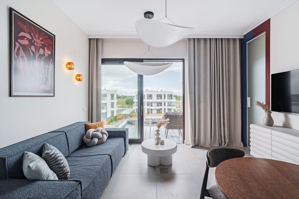 Standard wykończenia: nowoczesny design inspirowany stylistyką morską, obłe formy, szlachetne materiały, wysokie drzwi, mieszkanie w pełni umeblowane i wyposażone.