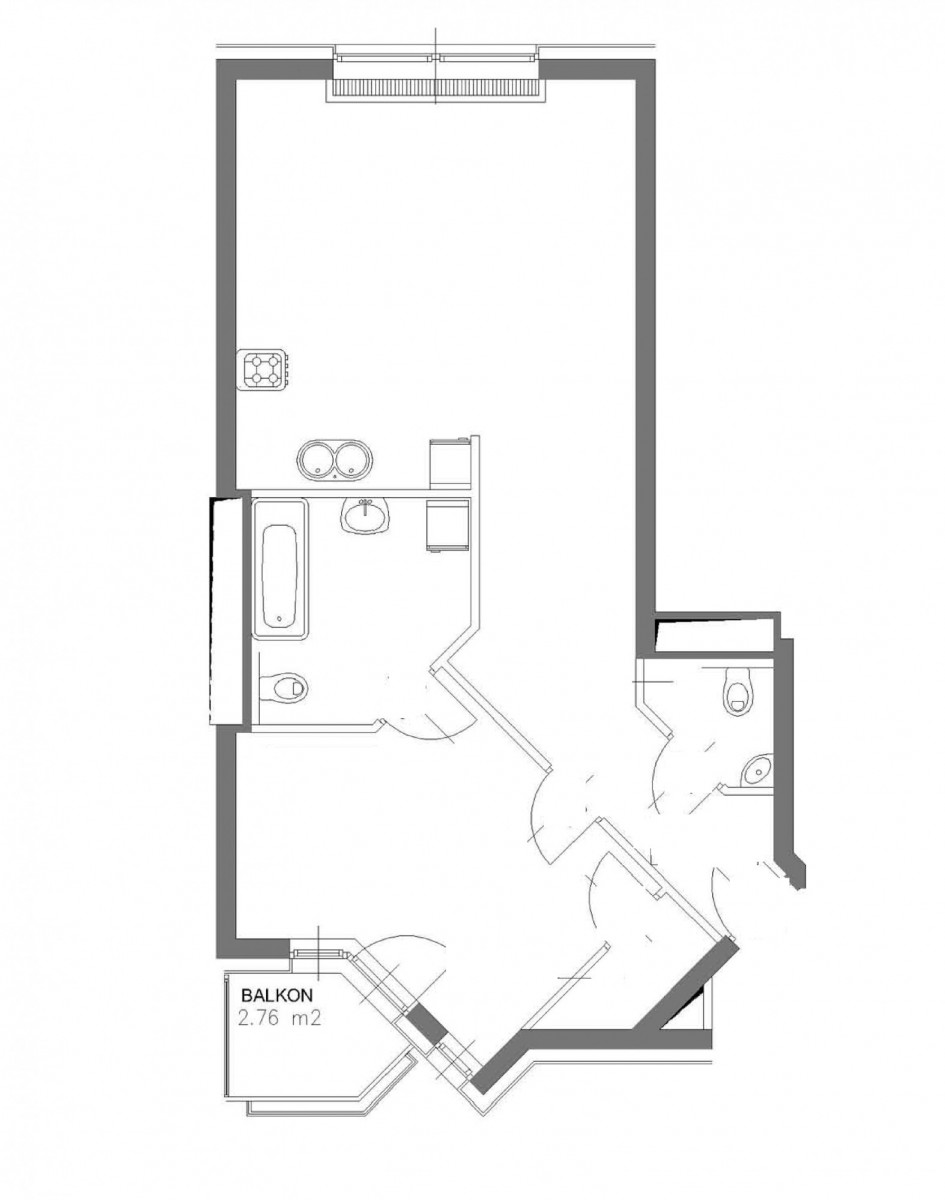 Mieszkanie składa się z dużego salonu z aneksem kuchennym (25,46 m2), sypialni (14,05 m2) z balkonem (2,76m2), przedpokoju (3,5 m2), garderoby (1,68 m2), łazienki z WC (6,65 m2) oraz dodatkowej toalety (1,94 m2).