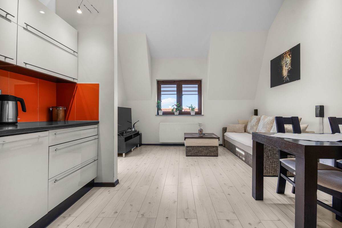 Na pierwszym poziomie jest salon z aneksem kuchennym /łączna powierzchnia 22,5 m2/, dodam, że jest to powierzchnia klimatyzowana. Z salonu, a jakże, jak w domu mamy wyjście na taras. Taras ma dużo prywatności a jego powierzchnia to 9 m2.